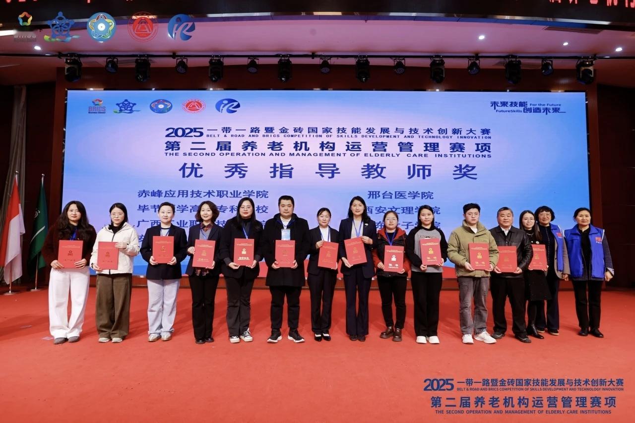 2025一带一路暨金砖国家技能发展与技术创新大赛第二届养老机构运营管理赛项决赛圆满落幕,邢台医学院护理系2024级养老服务管理专业本科班王麒、张丹琳、王子涵团队斩获本科组全国一等奖(第一名),指导教师刘娜、郑春贵荣获优秀指导教师奖,实现了我校养老服务管理本科专业在全国专业技能赛事中的突破。