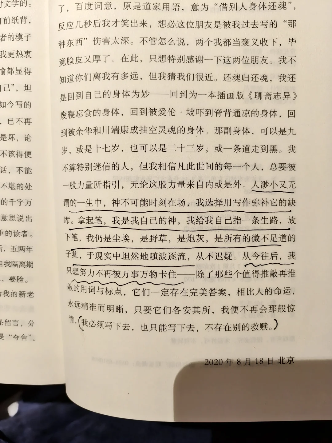人渺小又无谓的一生中,神不可能时刻在场,我选择用写作弥补它的缺席。拿起笔,我是我自己的神,我给我自己指一条生路。放下笔,我仍是尘埃,是野草。是炮灰,是所有的微不足道的子集,于现实中坦然地随波逐流,从不迟疑。