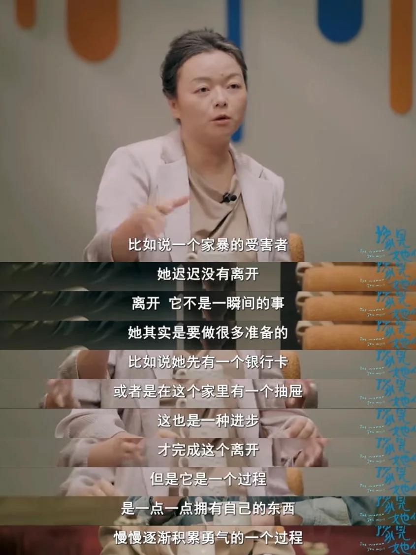 1⃣张春谈到她在工作中遇到的一种情况,一个受家暴的女性受害者,但是她迟迟没有离开,是因为她要准备,首先要有自己的银行卡,在家里还要有自己的抽屉,积累勇气和资源。因为离开不是一瞬间的事情。