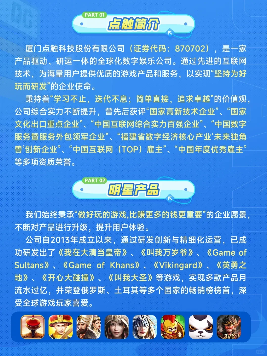 点触科技成立于2013年,新三板挂牌企业。总部厦门,在深圳、广州、芜湖、海南设有分部,员工总数约800人。点触是历史养成类头部公司,主要产品《我在大清当皇帝》《叫我万岁爷》《Vikingard》《Game of Khans》《Game of Sultans》等,在国内外拥有庞大玩家群体。