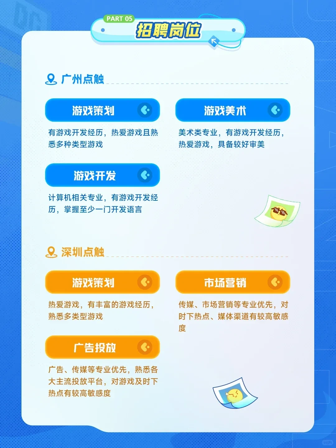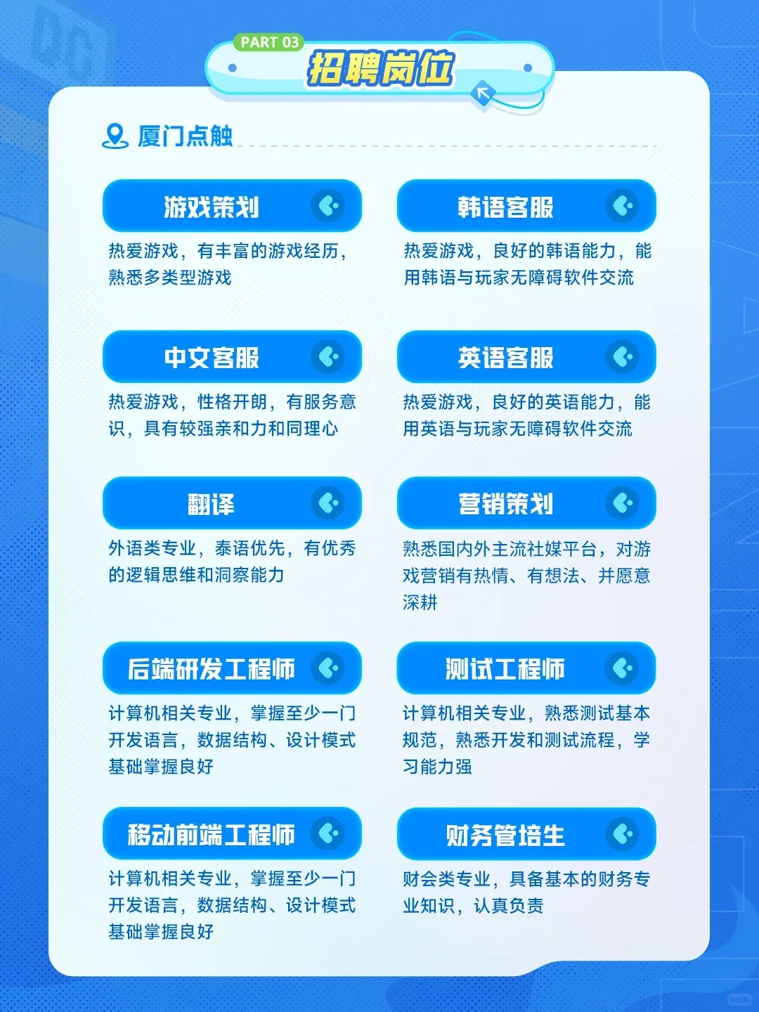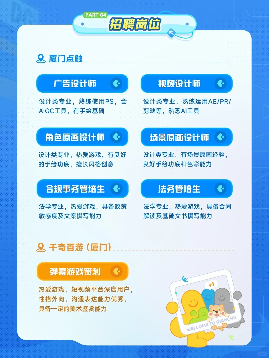 本届校招,点触面向应届生开放策划、市场、技术、美术、综合等岗位,工作地点覆盖厦门、深圳、广州。