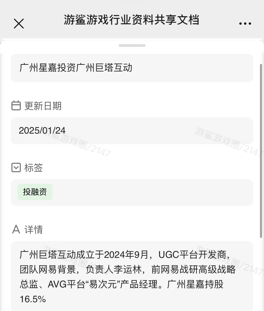 广州巨塔互动成立于2024年9月,UGC平台开发商,团队网易背景,负责人李运林,前网易战研高级战略总监、AVG平台“易次元”产品经理。广州星嘉持股16.5%