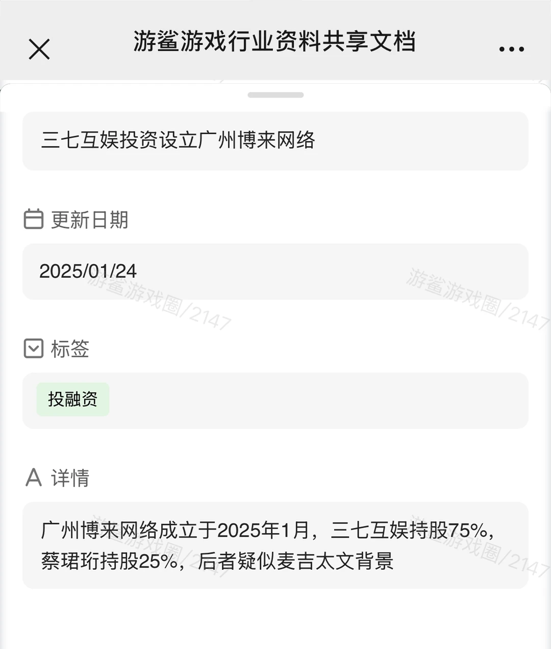 广州博来网络成立于2025年1月,三七互娱持股75%,蔡珺珩持股25%,后者疑似麦吉太文背景