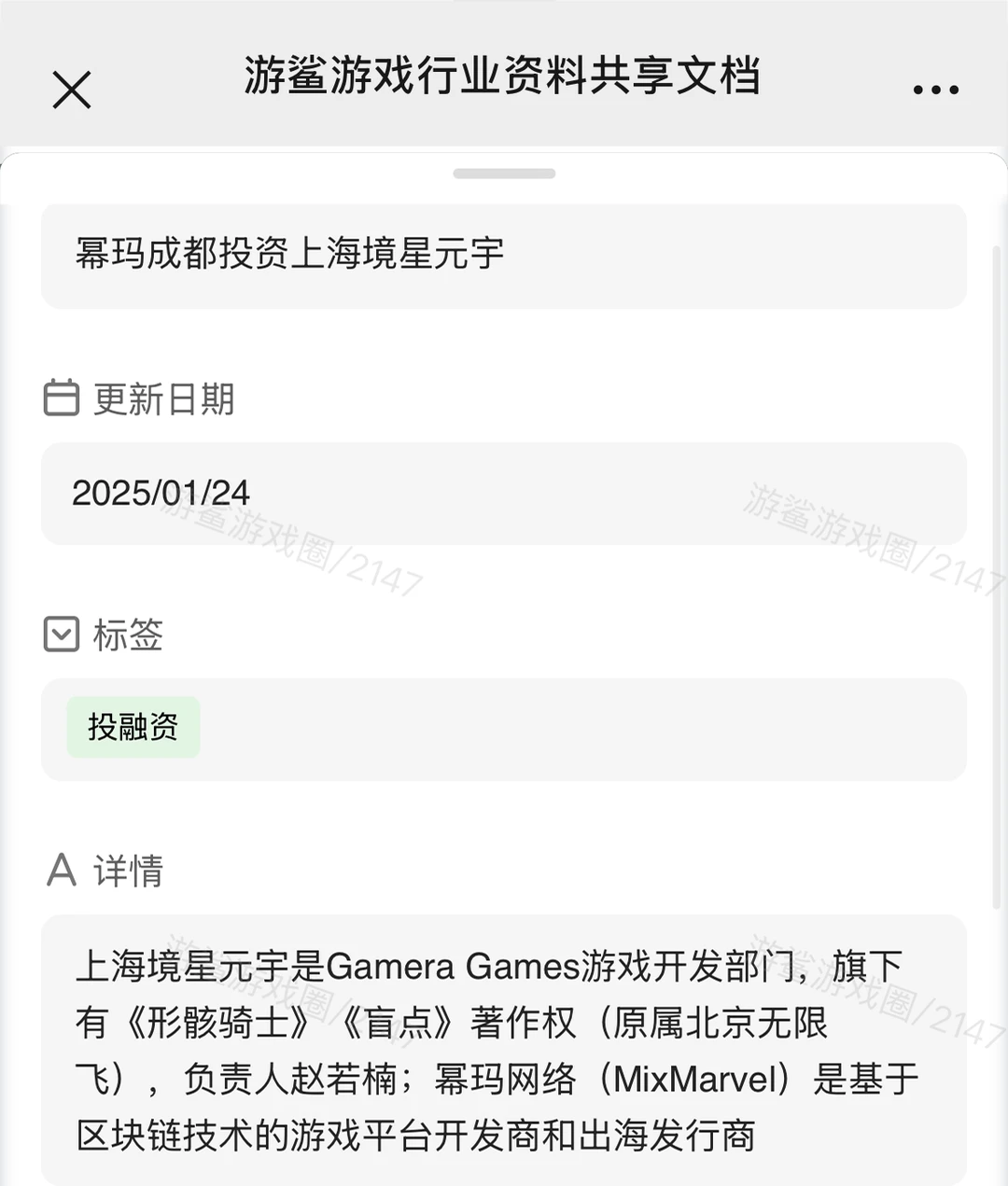 上海境星元宇是Gamera Games游戏开发部门,旗下有《形骸骑士》《盲点》著作权(原属北京无限飞),负责人赵若楠;幂玛网络(MixMarvel)是基于区块链技术的游戏平台开发商和出海发行商