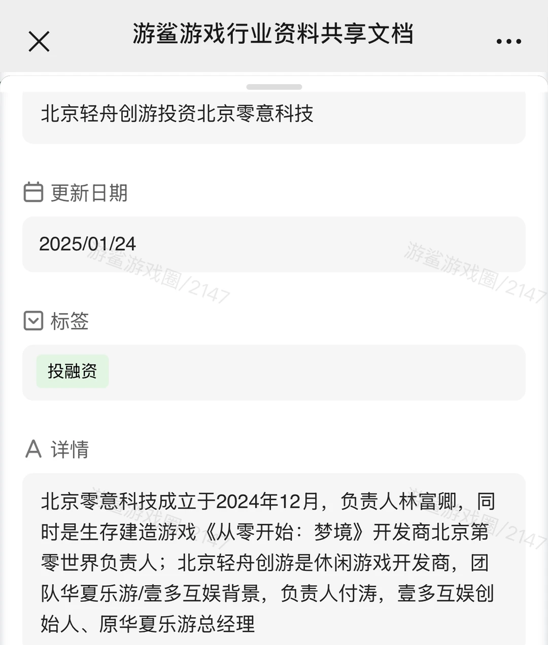 北京零意科技成立于2024年12月,负责人林富卿,同时是生存建造游戏《从零开始:梦境》开发商北京第零世界负责人;北京轻舟创游是休闲游戏开发商,团队华夏乐游/壹多互娱背景,负责人付涛,壹多互娱创始人、原华夏乐游总经理
