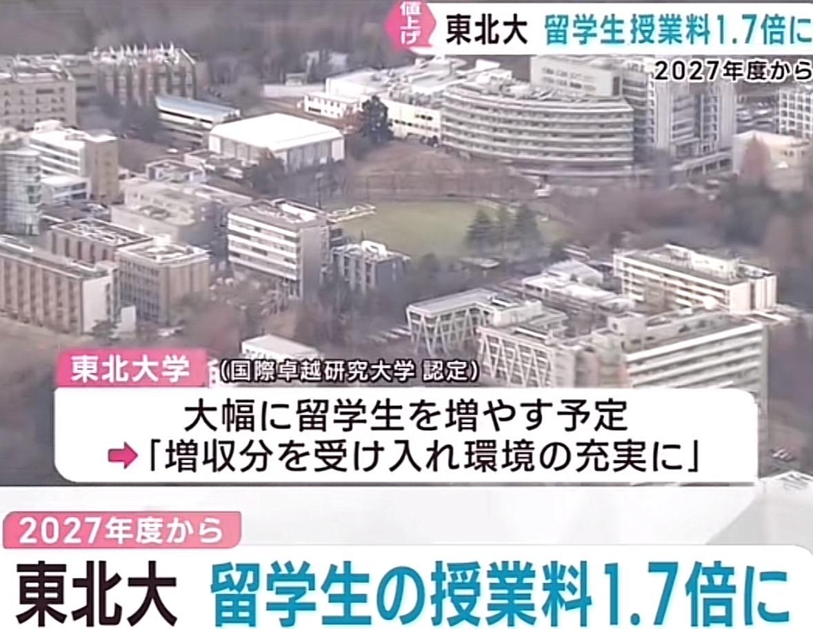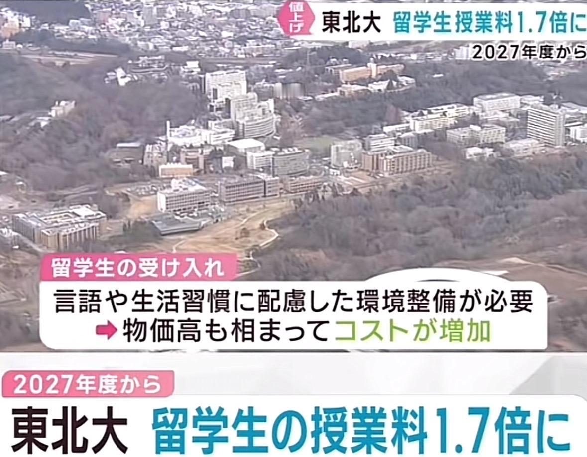 没想到一直以来存在感比较低的日本东北大学这次突然当起了出头鸟。东北大学宣布2027年度开始留学生一年授业料从53.58万日元涨到原来的1.7倍的90万日元。 日本通货膨胀物价一直上涨,反对外国人政策等大背景下,估计接下里很多大学会跟进。留学生的日子不好过了。