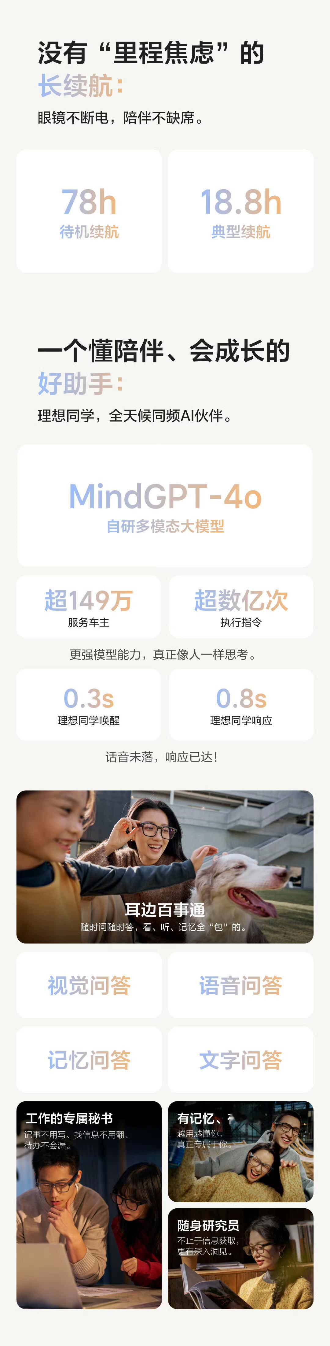 理想发布了首款 AI 眼镜 - Livis。昨天,皓宇全程讲了理想AI眼镜的发布会,表现堪称完美,这无疑是理想汽车最成功的发布会之一!唯一的遗憾是未能邀请易烊千玺到场。我仍清晰记得 2024 年(第二届)广州车展上,皓宇首次向我展示 demo 状态的理想同学 App 时的情景 —— 那一刻我无比激动!当时尚不确定理想是否已规划 AI 眼镜,但如今一切脉络已然清晰。若没有自研基座模型 MindGPT和理想同学 App的技术积累,打造智能眼镜几乎是不可能的。而现在,所有布局都展现出战略合理性。若问理想汽车的核心优势,我会毫不犹豫地说是智能座舱,其灵魂便是理想同学。作为车主,理想同学的卓越体验无需多言。我们无数次听到用户希望理想同学突破车载场景,当在家中呼唤却得不到回应时,那种失落感令人印象深刻。如今,可随身携带的理想同学来了 —— 它就是理想 AI 眼镜 - Livis。Livis 的诞生并非单纯为盈利,而是让理想同学突破车载场景的一次具象化实践,更是让更多人体验其魅力的入门级产品。这款产品凝聚了匠心:支持无线充电、拥有超长续航、采用人体工学设计、搭载蔡司镜片,处处体现着对用户体验的极致追求。Livis 的核心功能包括:1.拍照和录像:一句话就可以实现,而不用打开手机!2.知识问答:一句话就可以实现,而不用打开手机!3.车辆控制:一句话就可以实现,而不用打开手机!4.听歌和录音:一句话就可以实现,而不用打开手机!……以上功能最核心的体验是快!还有续航长,可以用一天!然而,这一切只是开始,随着理想同学的不断进化,体验会越来越好! 理想同学 livis 理想ai眼镜livis 理想同学Livis理想同学