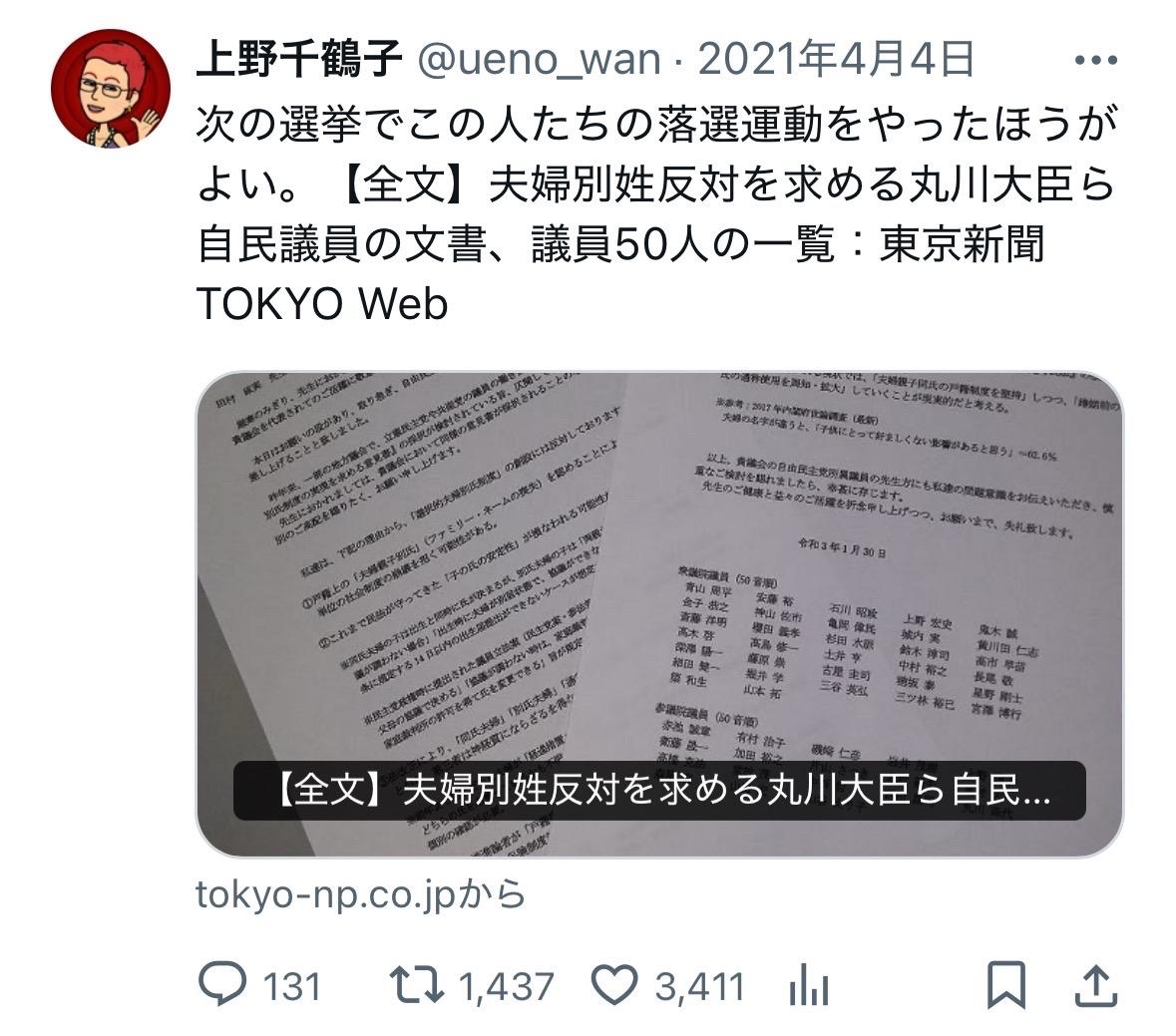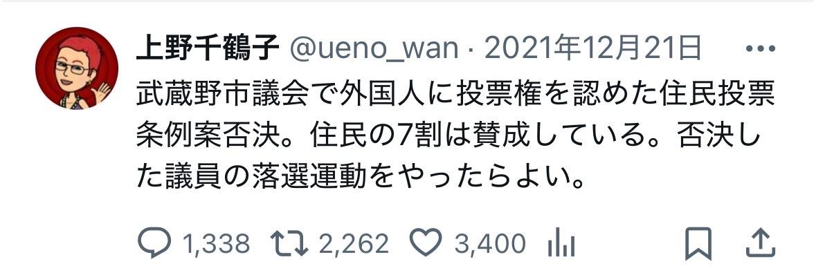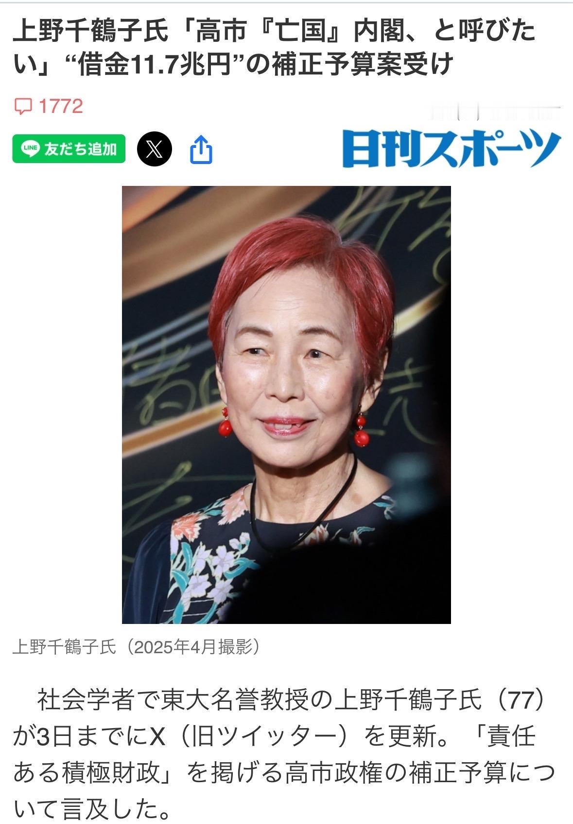 社会学者东京大学名誉教授上野千鹤子12月3日在X发文。 直指高市内阁刚通过的修正予算案。 “修正予算18.3兆日元,其中国债名义的借金11.7兆日元”,这样进行财政运营的政权“真想叫高市‘亡国’内阁”强烈批评高市内阁的财政政策。 日本人对日本政府借债不安可以引起共鸣,但对刚起步不久的支持率很高的高市内阁直接用“亡国”这样激烈的字眼确实让大家惊掉下巴了。 不过,看看上野女士以前发的呼吁大家让不支持夫妇别姓和不支持给外国人投票权的议员下台的投稿,就不会觉得有啥奇怪了。