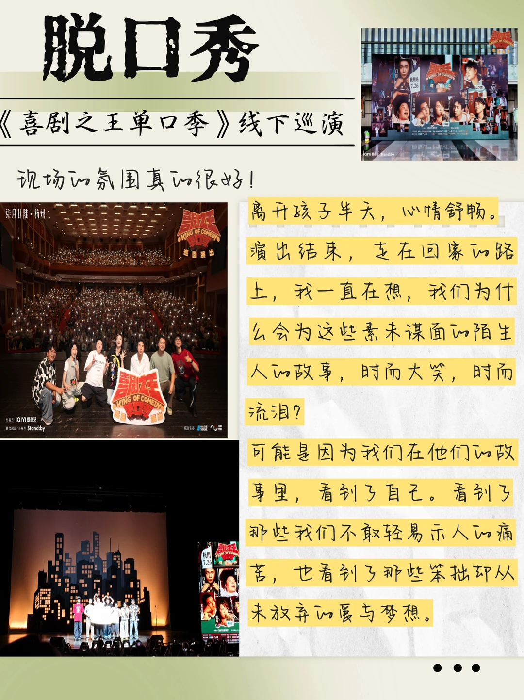 2⃣看了一场线下的脱口秀,忍不住感慨,日常的一句对话,一点看似不起眼的小事都能成为他们创作的素材。也更加坚定了做一个内容创作者[害羞R]。