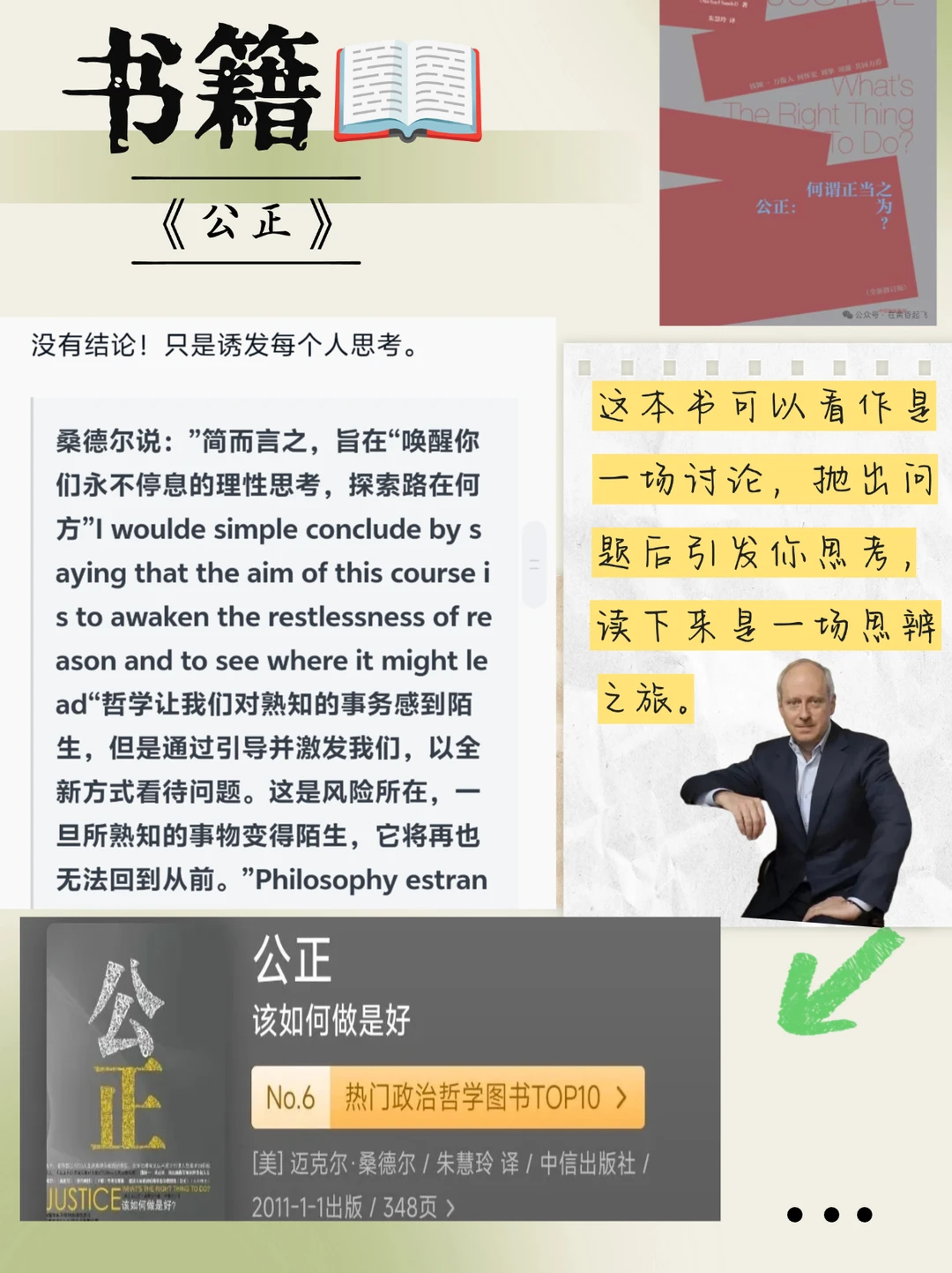 🔶《公正》这是一本桑德尔的著作,探讨了一些经典的议题,个人感觉比较难读,有点形而上。可以去看看他和许知远的一期《十三邀》,感觉会更有启发。
