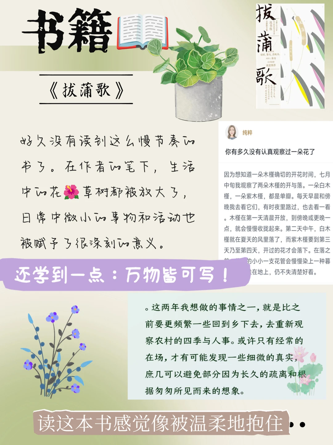 🔶《拔蒲歌》一本散文集,这本书的豆瓣评分还挺高的。有一句评论说:在她的文字里,我们重新拥有了过去。记录了都是童年,日常的小事,值得回味。