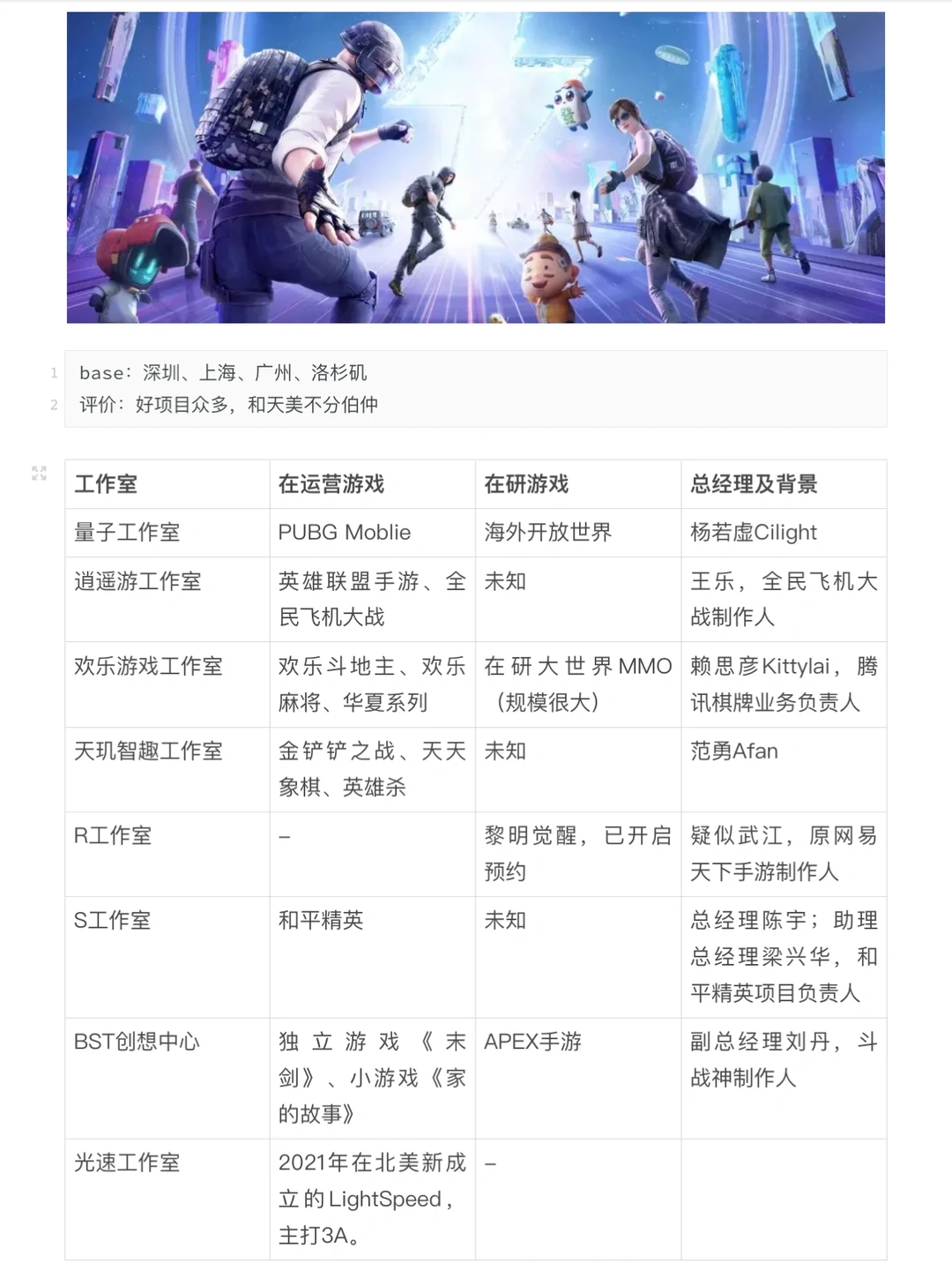 3、各个工作室都是独立运营,互相竞争,而且腾讯游戏并不会给各个工作室划分赛道,MOBA、FPS、MMO……谁有实力谁上。也可以理解为腾讯养蛊;