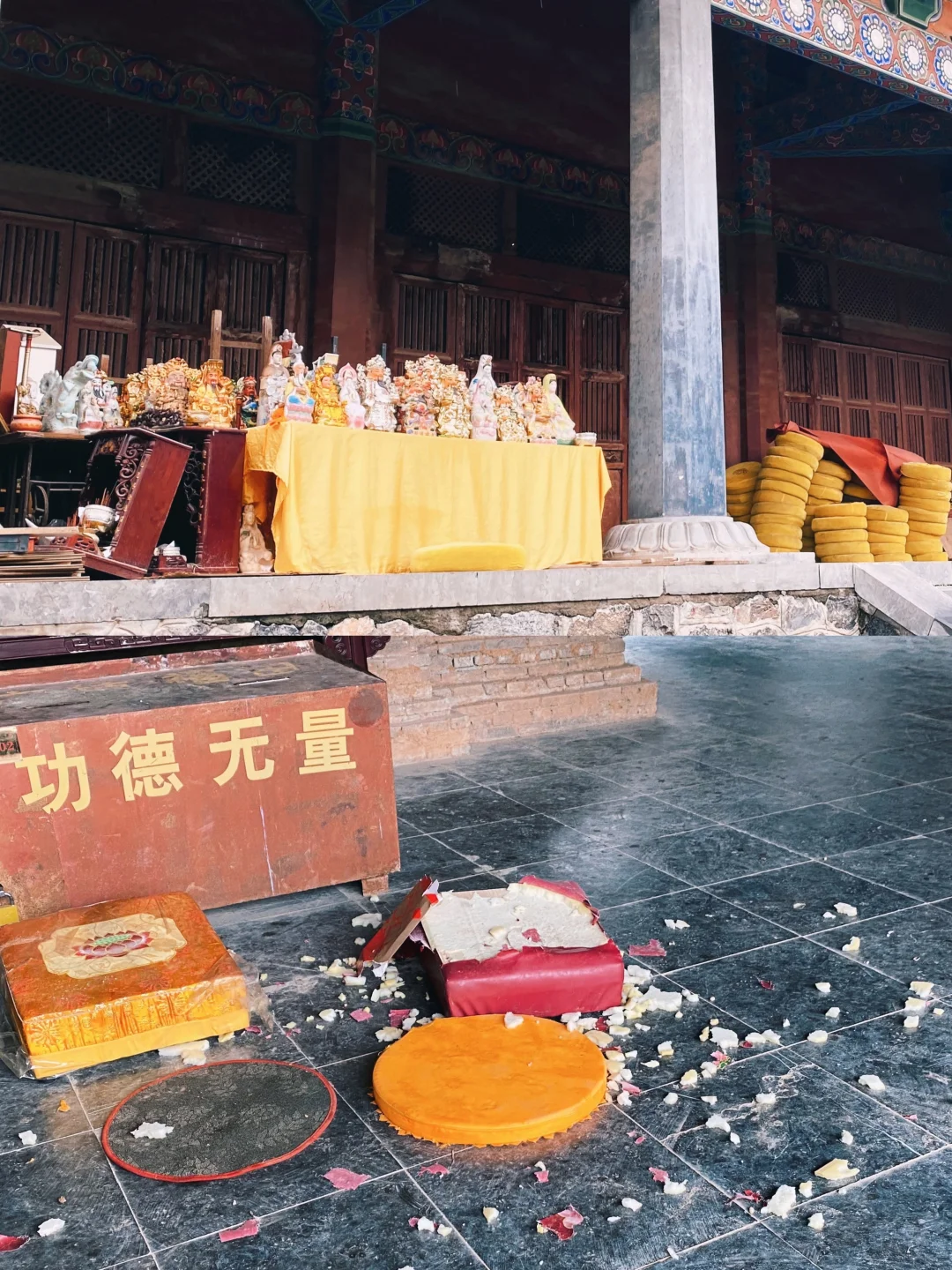 😮💨虽然寺庙破败不堪,但还是依稀有香客过来烧香,兴许也实在看不下去菩萨们如此孤苦伶仃吧,但反过来讲:泥菩萨自己都~难保金身了,又如何保佑众生呢?