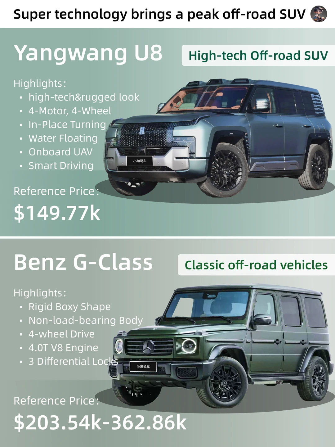🌟Yangwang U8: Wang Chuanfu, the founder of BYD, has redefined the luxury of off-road SUVs with China's advanced automotive technology. As a hybrid off-road SUV, Yangwang U8 is independently driven by four wheels. This not only ensures its cross-country ability but also enables functions like turning on the spot and emergency flotation.