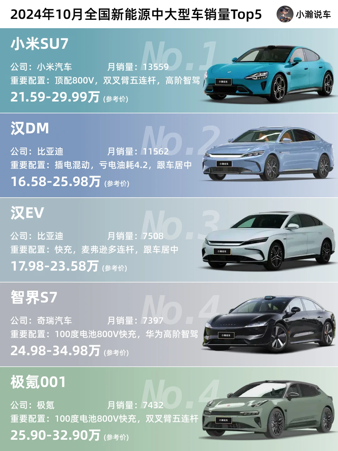 [黄色心形R]中大型车:小米SU7产能突破两万(不说销量,大家都懂),新款比亚迪汉继续表现强势,智界S7也终于上榜