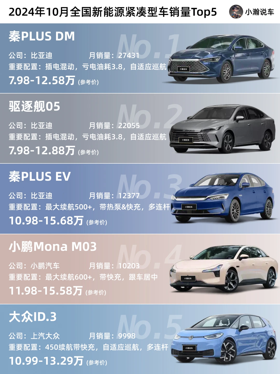 [蓝色心形R]紧凑型车:前三依旧无悬念,小鹏爆款MONA M03杀到第四位,降价后的大众ID3上榜