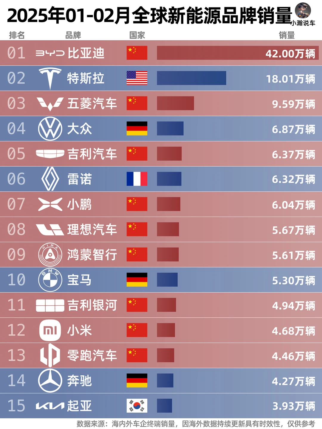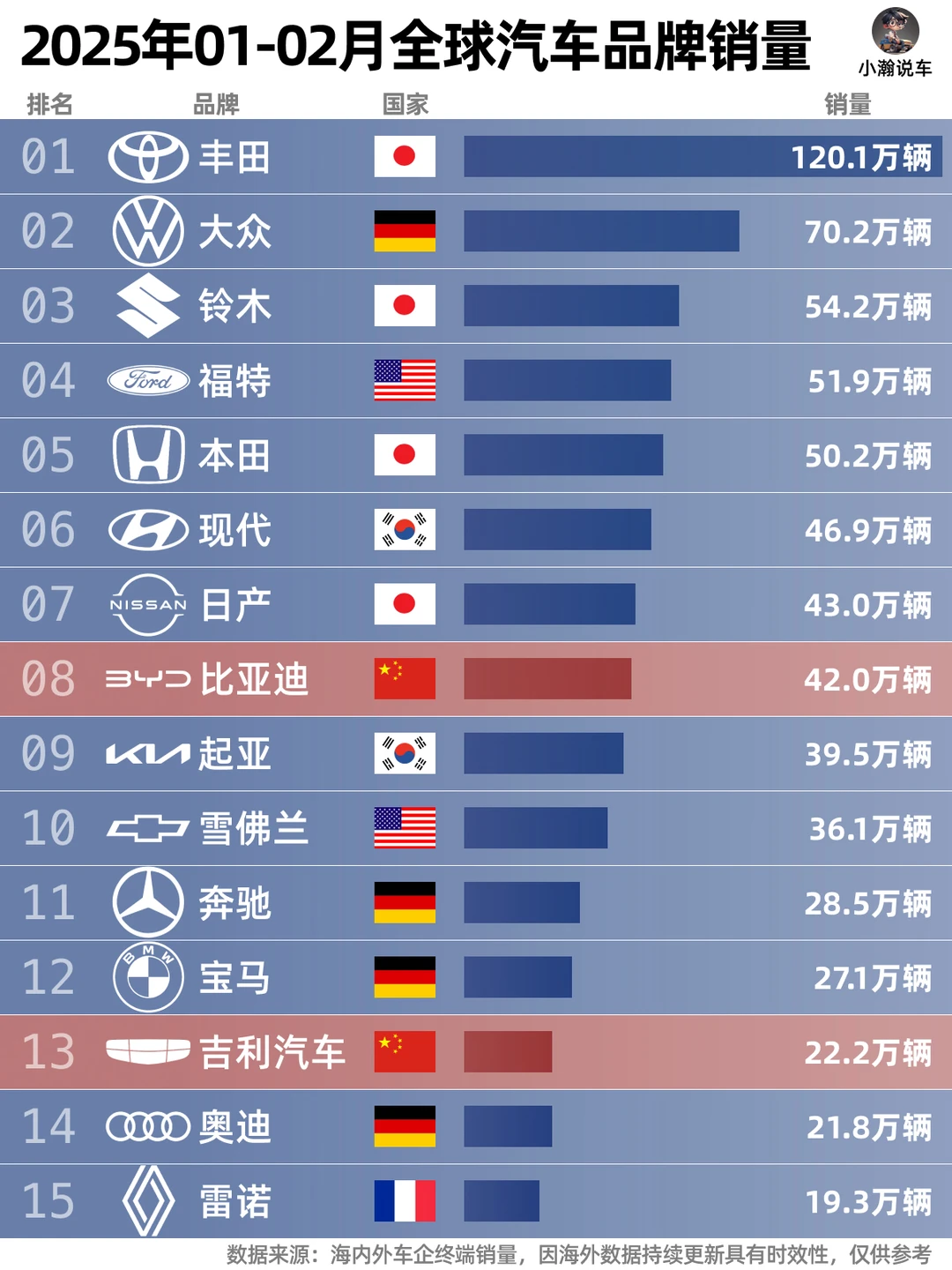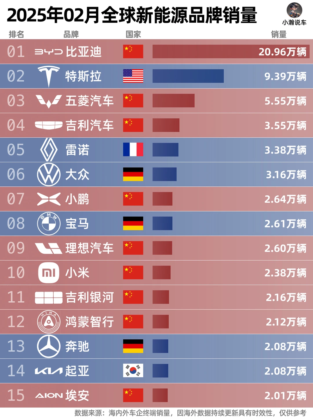 🌟销量总榜上:丰田大众依然稳居榜首。吉利很争气地冲进了前15,今年全年在总榜上也是剑指Top10!比亚迪虽然受国内市场春节的影响销量下滑,但依旧排在第8位。随着国内市场一众新技术、新车型的发布以及海外多地的扩张,今年国内外的销量想必会再创新高!你觉得2025年比亚迪能排第几呢? 🌟新能源榜上:雷诺宝马大众等传统品牌开始发力,旗下新能源车在多个市场取得了不错的成绩。但中国品牌依旧主导着这场全球新能源革命!小鹏、埃安等品牌国内外两线突破。小米、理想等也已经把出海提上了日程,后续表现非常值得期待!