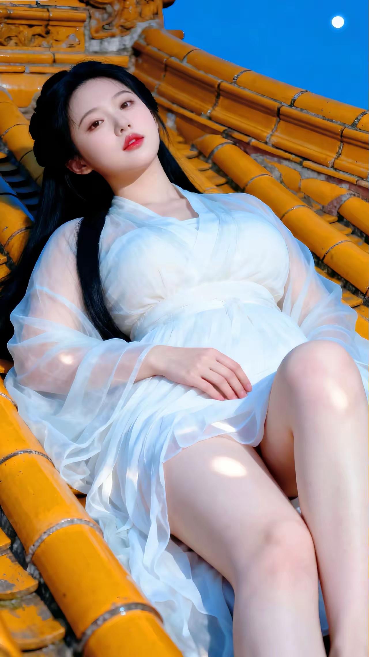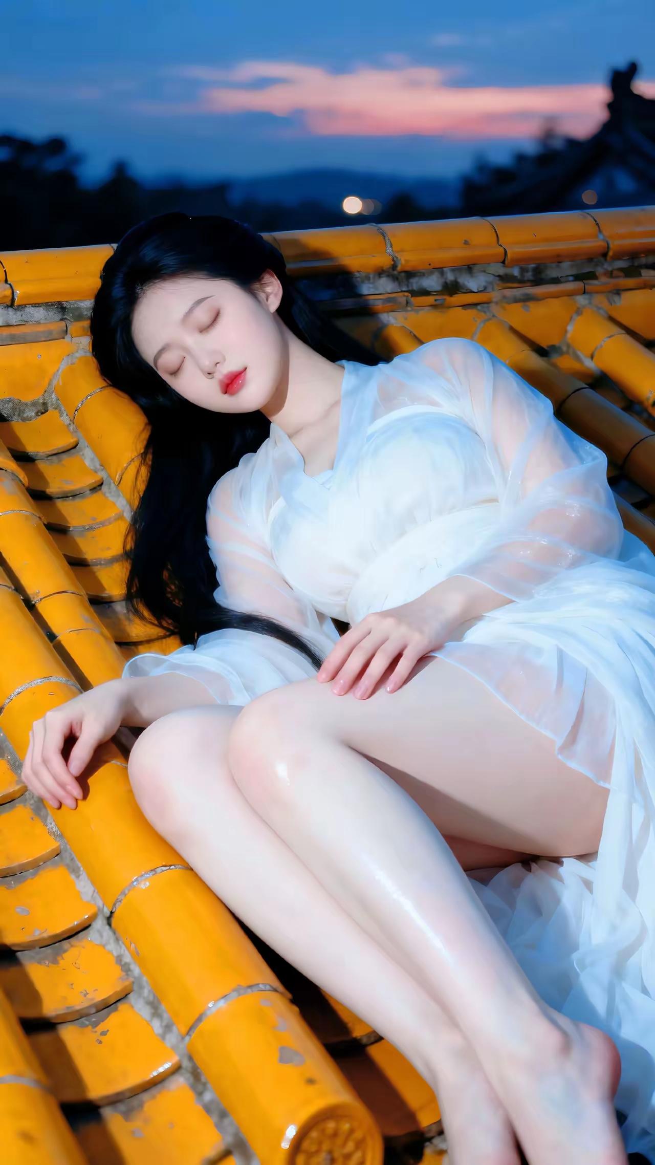 黄昏时分,少女倚靠在古风建筑的屋檐下,白纱裙随风飘逸,宛如画中仙子。