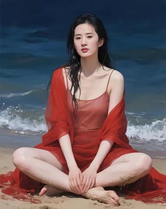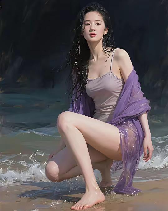 海边少女,紫色纱裙,微笑看海浪,夏日清凉时光。