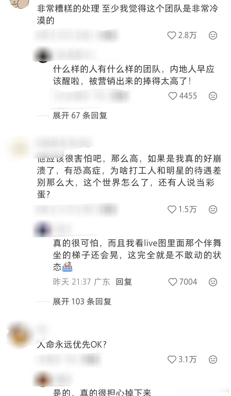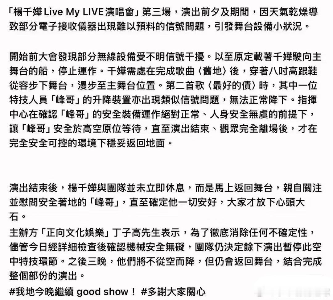杨千嬅演唱会伴舞吊在空中一整场 真的太危险了,好歹人是安全下来的,要是中途出了什么事,工作室就不是这个回应了,在上面一场演唱会,上厕所都是问题