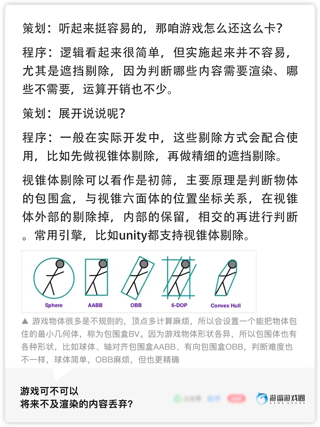 在复杂的3D场景中,有很多物体可能因为被其他物体遮挡而不会被用户看到,如果对这些不可见的物体进行渲染,就会浪费GPU资源。为了减少不必要的绘制、提高游戏性能,需要进行剔除,常用技术有遮挡剔除,视锥体剔除等等。