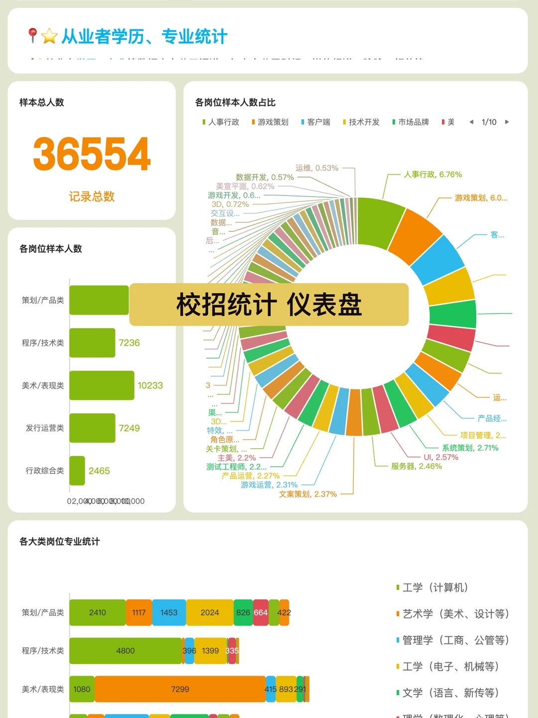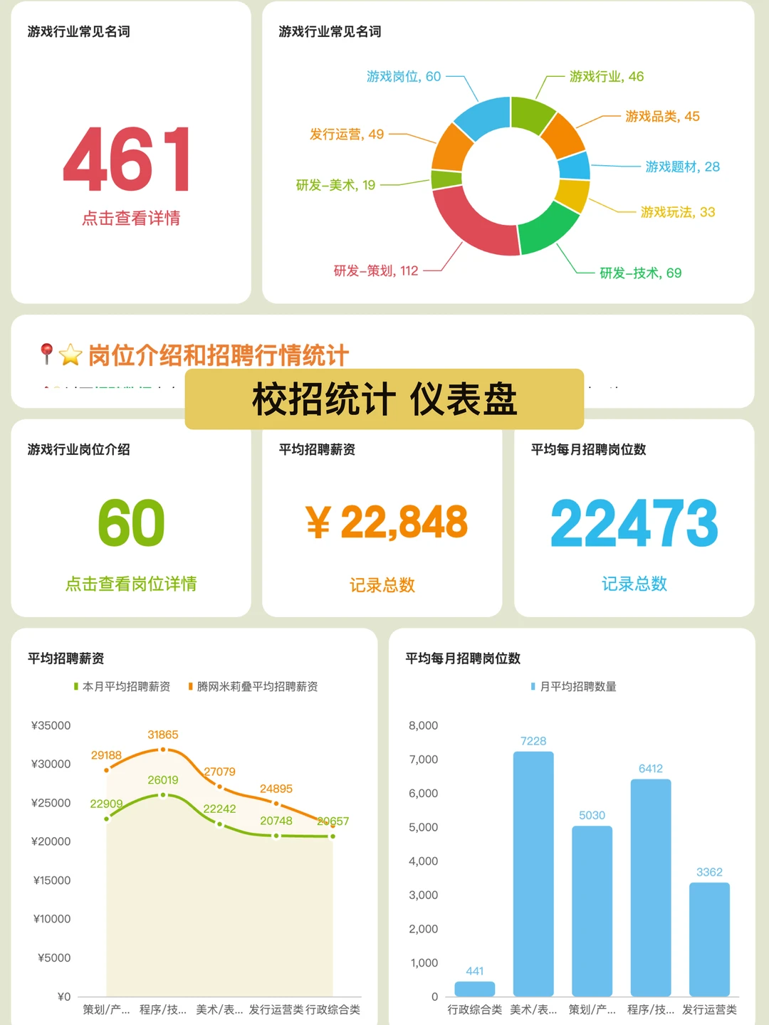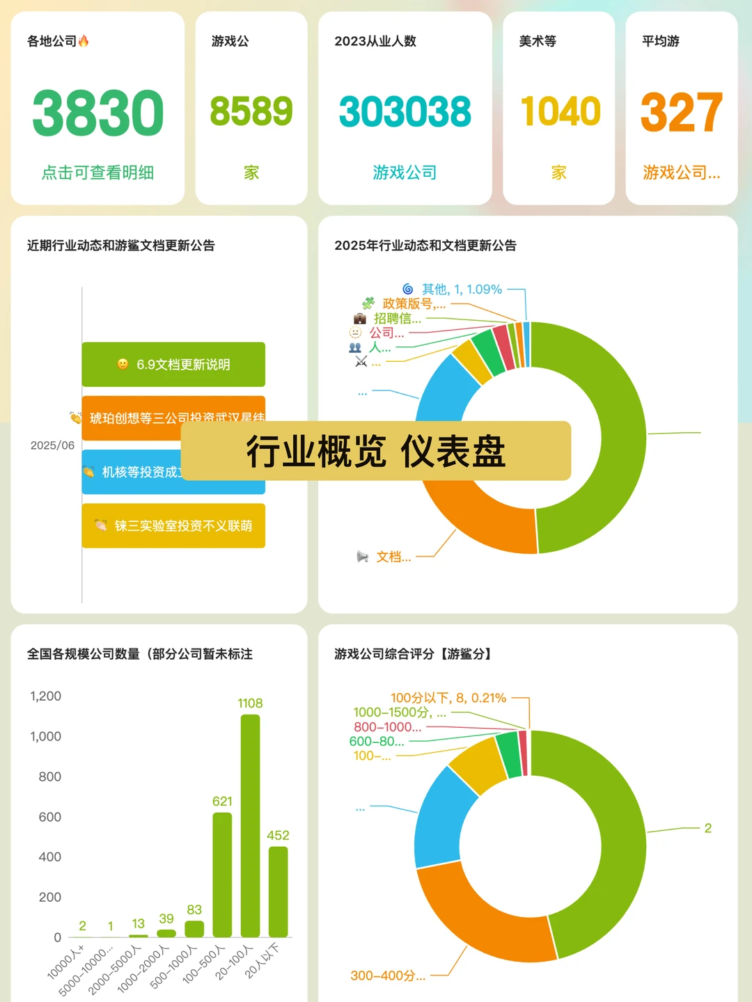 3️⃣三是 新建了4个数据仪表盘,具体有上文提到的「人数增减统计」,以及「校招统计&行业科普」、「社招统计」、「版号和知识产权统计」,再加上之前的「行业概览」(包含公司分类统计和投融资统计),一共5个数据仪表盘。