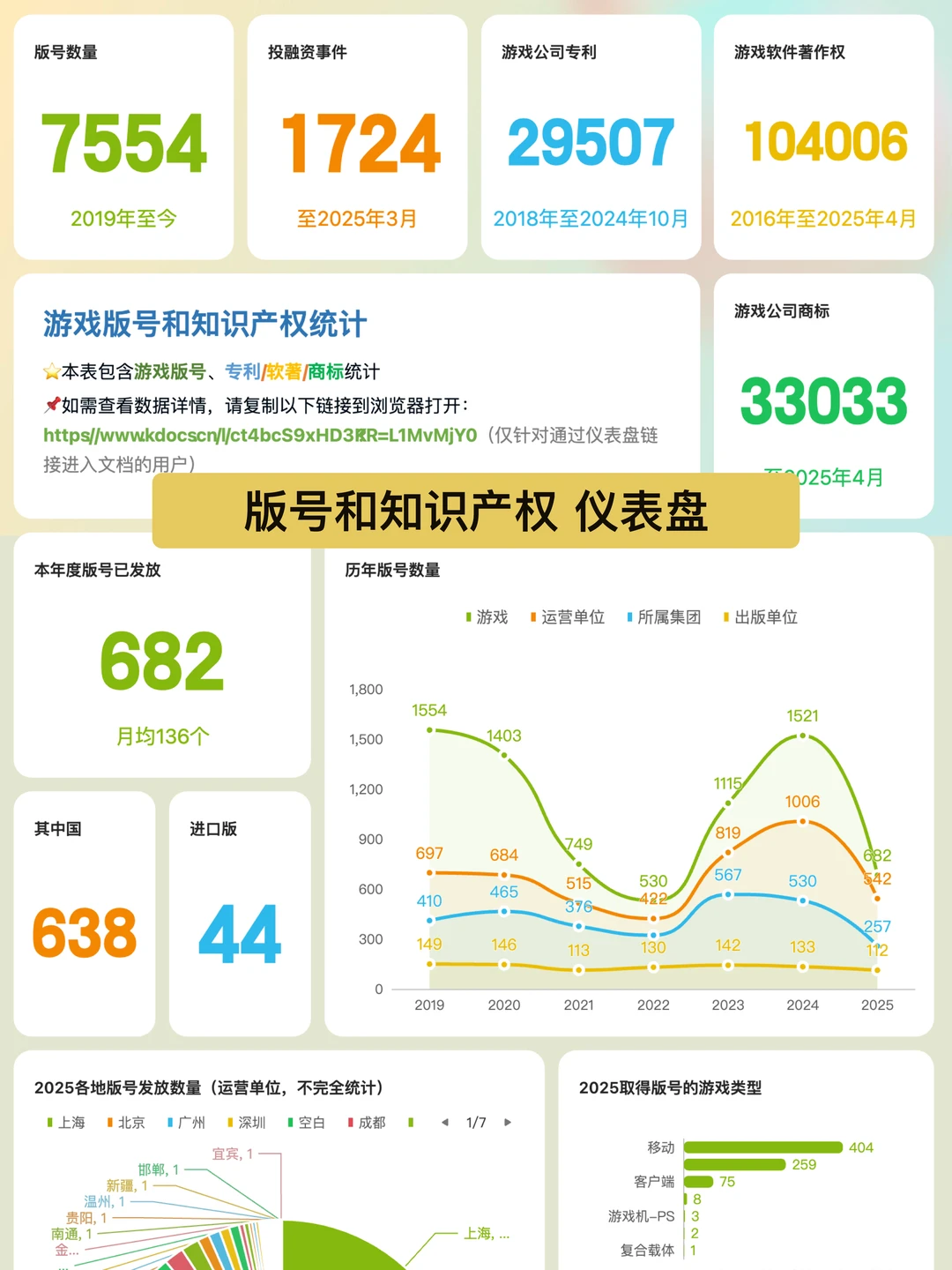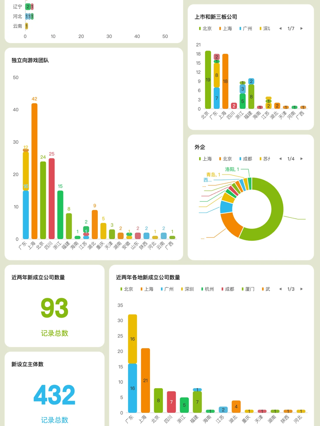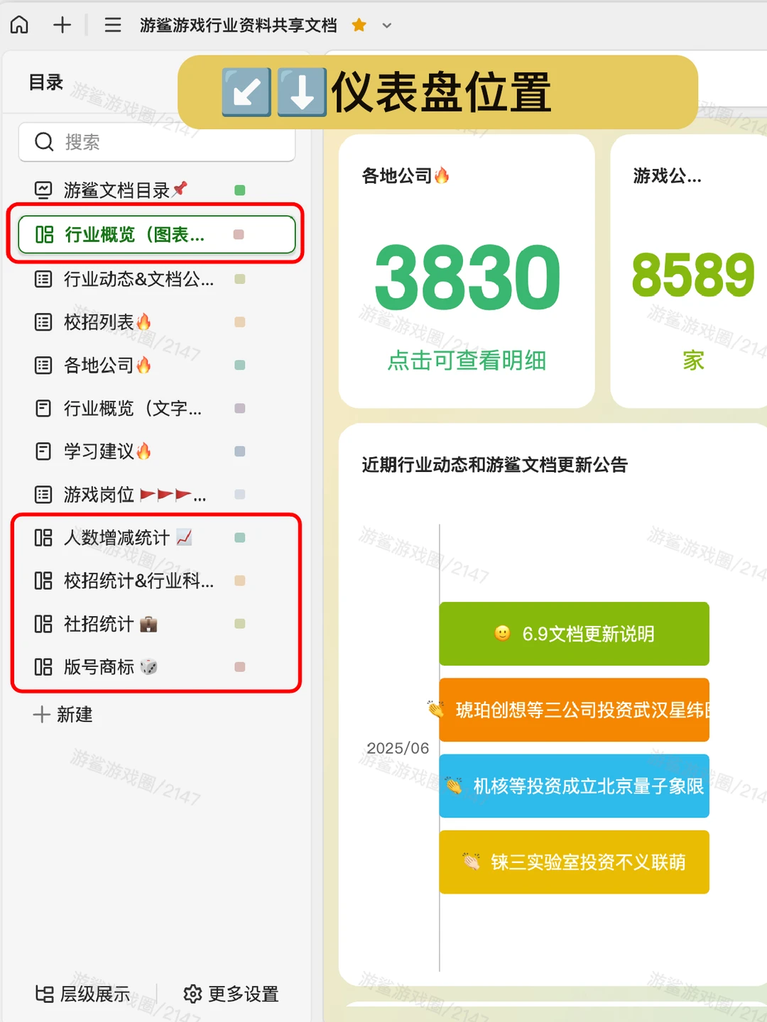 3️⃣三是 新建了4个数据仪表盘,具体有上文提到的「人数增减统计」,以及「校招统计&行业科普」、「社招统计」、「版号和知识产权统计」,再加上之前的「行业概览」(包含公司分类统计和投融资统计),一共5个数据仪表盘。