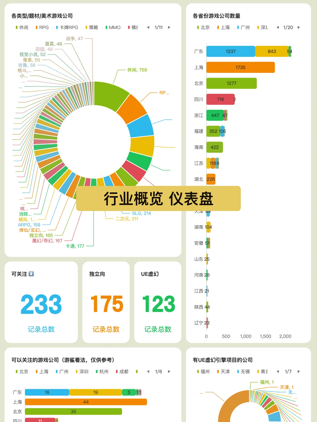 「行业概览」可以查看各省市有哪些游戏公司,上市公司、外企、独立向。可以查看游戏行业投融资事件……