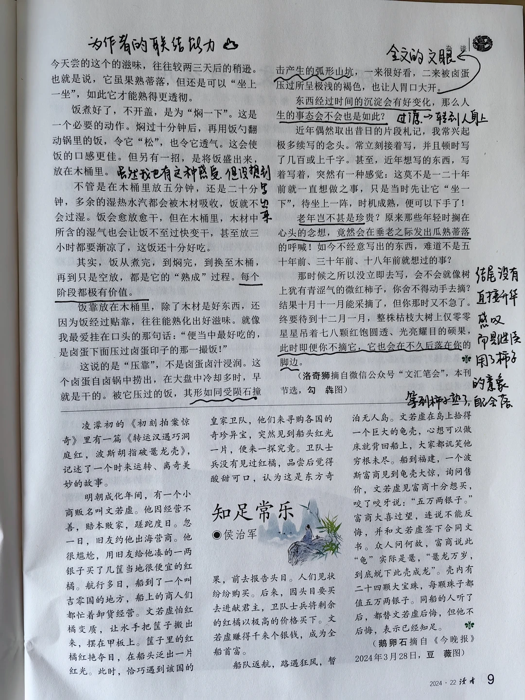 近期拆了一篇散文,写的真是妙啊[赞R]。 . 作者把日常中极其平常的事物和不起眼的行为串在一起。形成了一篇行云流水的散文。这篇文章的主题其实很简单:一样东西经过时间的沉淀会有好变化,但写的很有味道。有时候觉得,写作就像炒一盘菜,怎么把这么多的食材(素材)搭配好放进去,放多少,要放的好吃,让人不腻。成为一盘佳肴[偷笑R]。 . 下面就来拆解一下。 1️⃣素材选择要丰富,小众 我认为,这篇文章最出彩的地方就是素材了,细数一下,一共用了8个素材。虽然这些素材看似都不起眼,但串在一起,就很有味道。 . 👉比如我们知道葡萄酒开了要醒酒,知道要醒面,知道要焖饭,但不会串在一起。学习素材的选择和搭配的能力。还有如何给素材排序。先讲什么,再讲什么。 . 2️⃣开门见山,直接用画面感写素材 如果换做是我,我会先引入一下:“喝过葡萄酒的都知道,要醒酒。”但直接像作者这样表述,更直接,也更容易切入主题,不拖沓。 . 3️⃣用短句,更有节奏感。 这篇文章读起来朗朗上口,很有味道。短句带来了节奏的美感。比如:“你若幸运,恰好经过,又是在人家墙外,或可拾起一尝,往往味道极甜。”在日常仿写的过程中,可以着重训练这个短句的能力。 . 4️⃣插入对话,打破单一的节奏 如果都是自己的叙述,素材就太单一,这里在素材中加入了一些语言,对话,就显得很生动,比如:“我们让它醒一会儿吧。”“他们能吃到一出水就进入嘴巴的新鲜鱼肉。” . 5️⃣巧妙连接,丝滑过渡。 文章素材很多,如何从一个素材到另一个素材,不显得生硬?过渡本质是逻辑的过渡。 . 6️⃣不评价,更高级 这篇文章中,都是素材的描写,没有作者的评价和刻意升华,让读者自己感悟,更高级。
