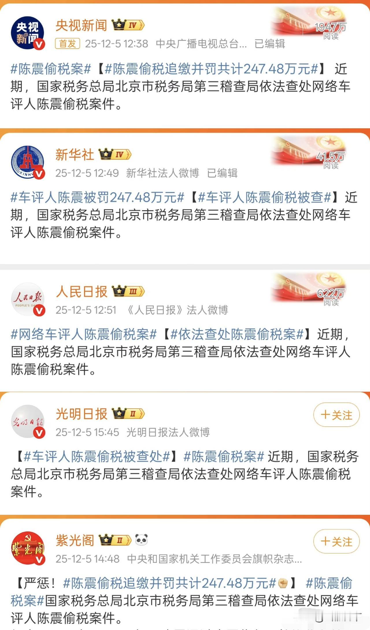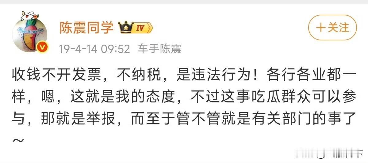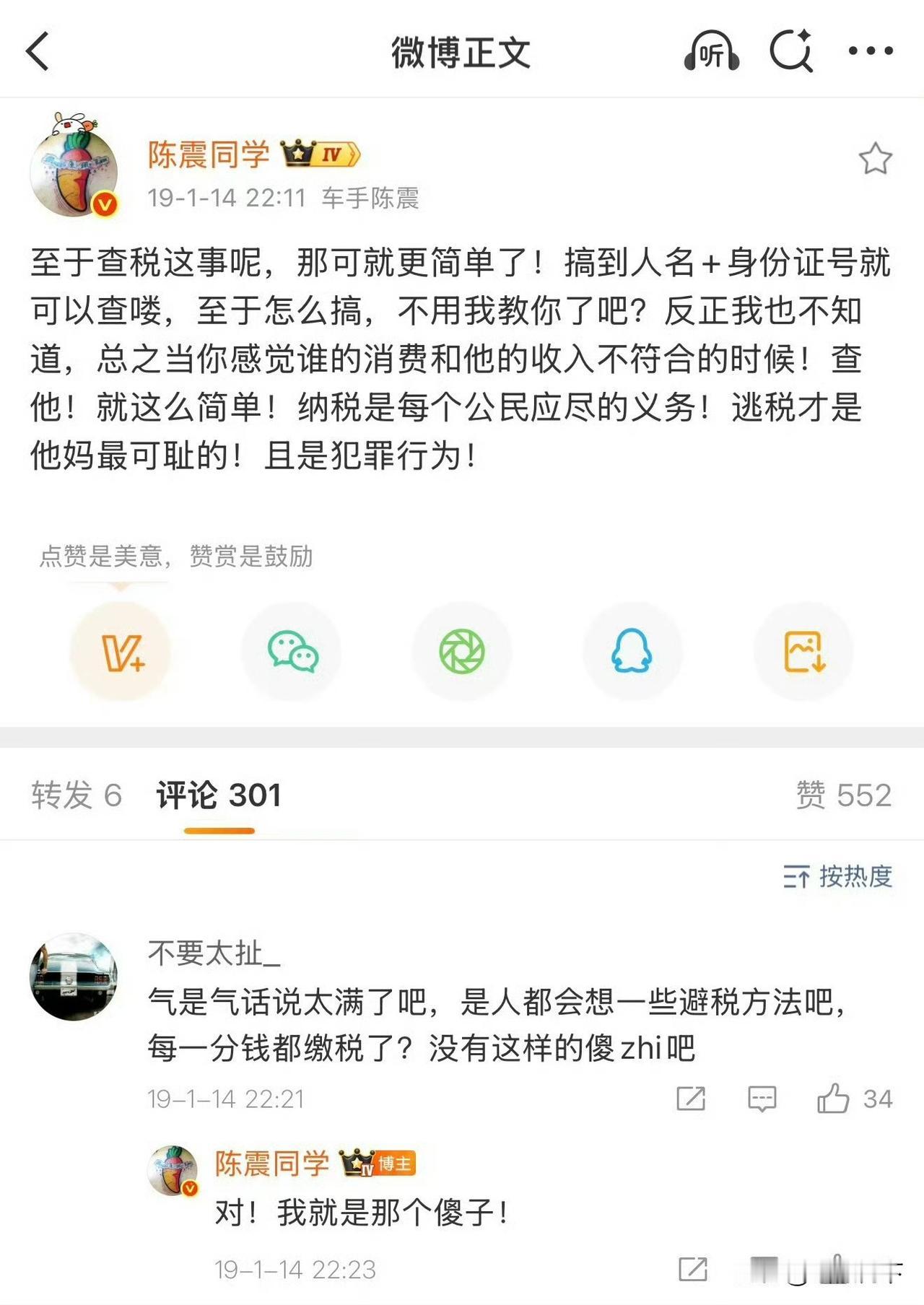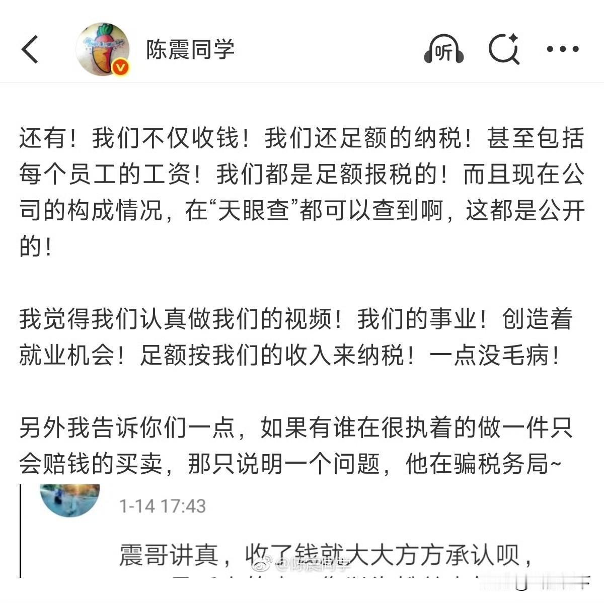 好家伙,这阵仗,知道的是偷税100多万,不知道的以为是100多亿呢,陈震这回还能翻身吗? 按理说像他们这些自媒体博主不缺钱啊,赚这么多钱为什么要偷税呢,真是人心不足蛇吞象,陈震还曾发文说:纳税是每个公民应尽的义务!逃税才是他妈最可耻的!且是犯罪行为! 这才过去多久,回旋镖就打自己身上了,网红的话不可信[笑哭][笑哭]