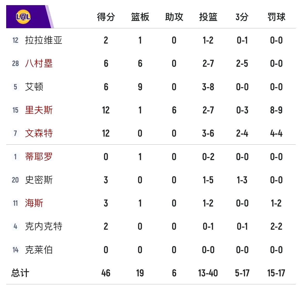 半场结束,湖人46-69凯尔特人。里夫斯文森特各得12分。 缺人不是借口,昨天残阵勇士和76人打到最后,有冠军气质的球队逆风局也不是这样打……