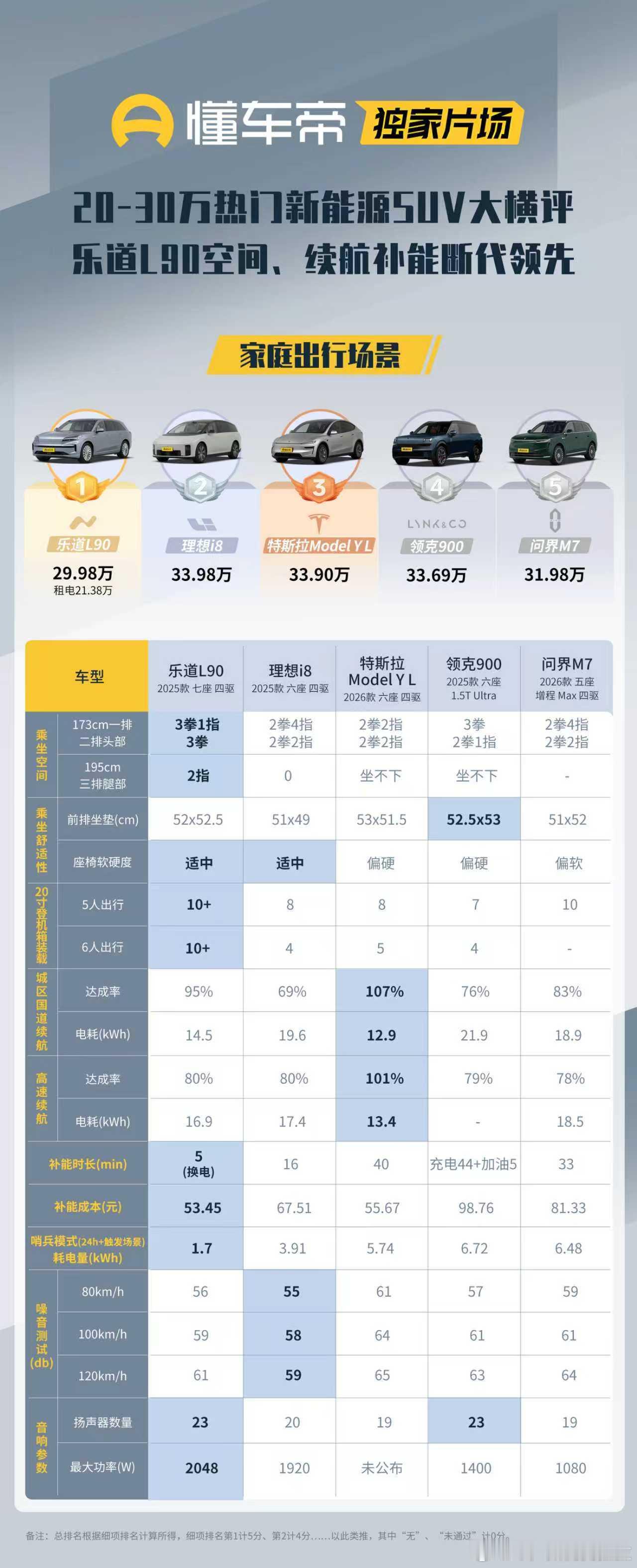 懂车帝 20-30w 纯电 SUV 大横评集中了目前市面上几乎所有人们款六/七座产品乐道 L90 在这个动力形式下的产品中绝对算得上是销量非常好的了空间大,座椅舒适,补能体系完善我这里提一嘴昨天乐道公众号发了个文写着给换电站加了八千块电池结果点进去发现真的要滑八千块电池才能滑到底(然后我傻傻的滑完了 一边滑我一边想说,你们就不能在两千块 四千块 六千块的地方做个标记吗)八千块电池加入换电体系后,点进换电站电池仓位就直观能看到变化对于这样一辆出行场景就是人多、路远一定会在春节回乡路上起到重要工具的车来说空间大 补能强可太重要了