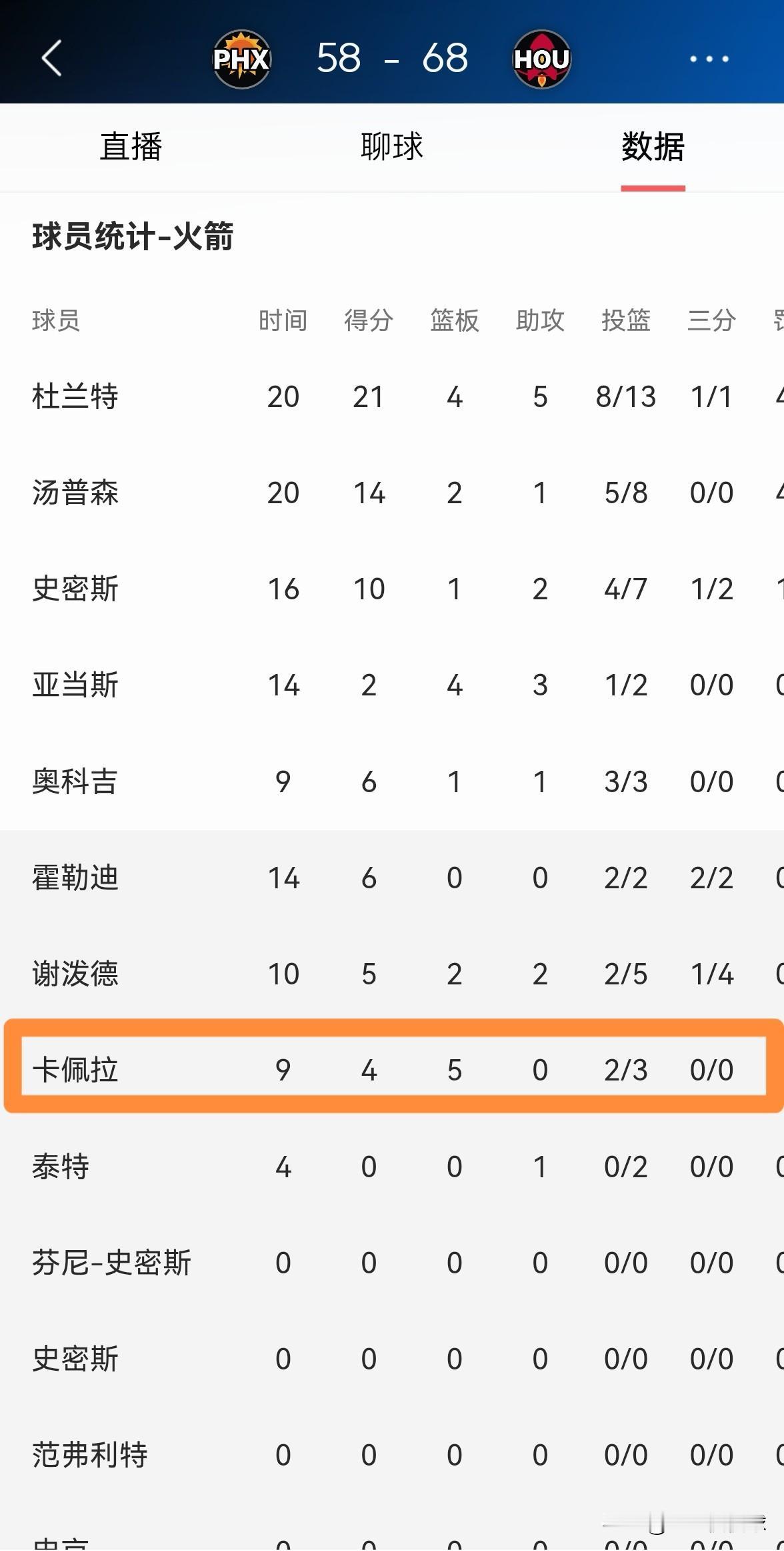 我真的要怒赞火箭老将卡佩拉!在今天火箭主场迎战太阳的上半场比赛中,兢兢业业的卡佩拉在替补出战的9分钟里,投篮3中2得到4分5篮板1盖帽,他在攻防两端都为球队提供了非常大的帮助。 卡佩拉是一名真正的职业球员,只要他上场,他就会在攻防两端拼尽全力,他从来不会在比赛中偷懒。