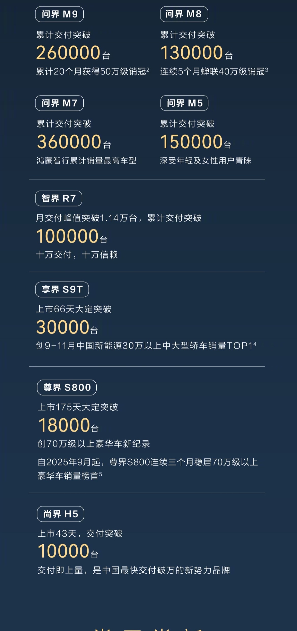 鸿蒙智行 43 个月破百万交付,这个速度确实配得上掌声。- 问界打头阵建认知。- 智界/享界卡价格带。- 尊界冲高端。- 尚界收割入门市场。鸿蒙智行「五界」,用差异化定位覆盖 20-80 万全价格段,效率极高。