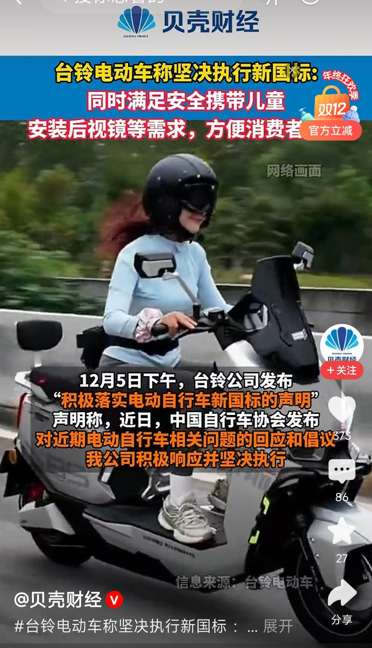 台铃电动车称坚决执行新国标 台铃电动车宣布将坚决执行新国家标准(新国标),以确保产品在安全性和实用性方面满足更高要求。此次调整不仅符合国家对电动车行业的规范管理,还特别强调了对消费者的关切,包括: 安全携带儿童:新国标规定了电动车的结构和安全措施,方便用户安全携带儿童,提升出行的安全性。 安装后视镜:新标准要求配备后视镜,增强驾驶时的视野范围,提升行车安全。 用户便利性:台铃强调其产品将同步满足这些新要求,方便消费者使用,提升整体骑行体验。 整体来看,台铃电动车积极响应国家政策,致力于通过标准化提升产品安全和用户体验,彰显其对行业责任的重视。台铃新国标电摩 新标准电动车