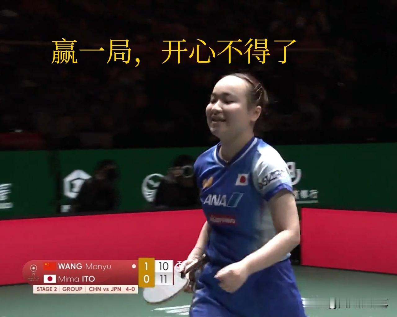哈哈,伊藤美诚刚笑了不到几分钟,便又变得垂头丧气[呲牙] 原来,王曼昱第二局早早建立了比分优势,并率先拿到了6个赛点。然而,风云突变,伊藤美诚凭借抢攻,挑打等手段加快比赛节奏,迅速将比分扳平,脸上还露出了开心的表情。尽管王曼昱通过暂停,改变发球等手段进行调整,但还是很遗憾输了第二局。 好在,第三局王曼昱打法不再保守,坚定技战术打法,又赢得最后一局。 输了球的伊藤美诚,最后摇头闭眼,满是心酸。王曼昱名场面 王曼昱生图 伊藤不老