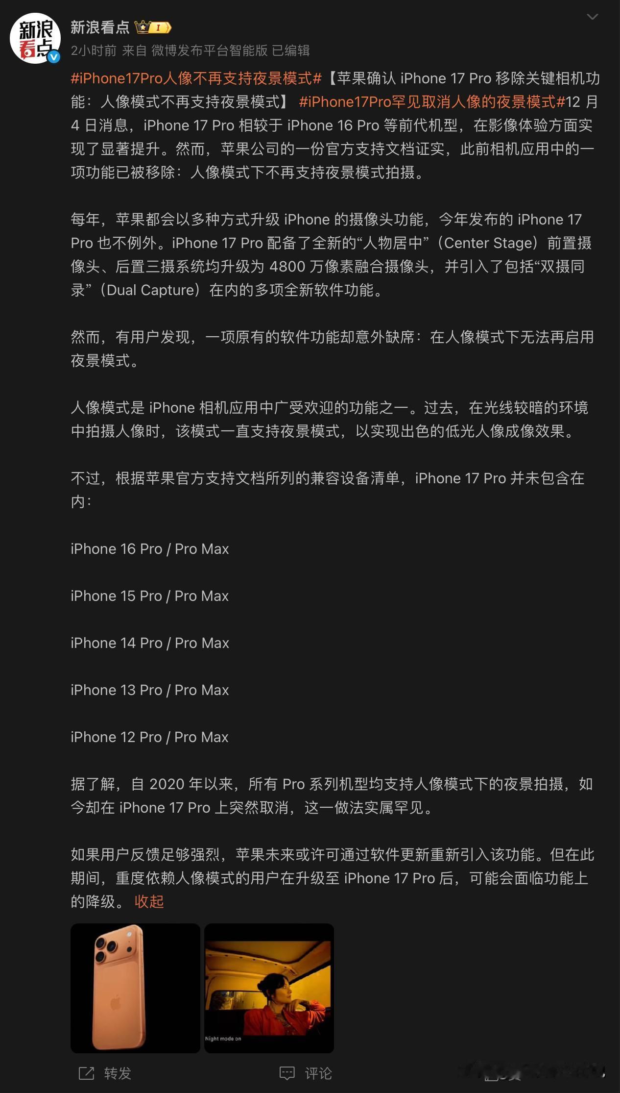苹果17pro系列手机疑似不再支持夜景人像模式,这点算是逆向优化吧!最近有消息曝出说iPhone17pro系列手机取消了夜景人像模式,刚听说这消息我就震惊了,要知道取消了夜景人像模式,拍照可玩度简直降低了一大截。如果这是真的,以后弄个17pro和之前的老版本手机一起出去玩儿,人家11、12、13、14、15、16都能在夜间愉快的玩耍,拍出美美的人像照,而最新款苹果却不能,这场面不要太好看了!有17pro的老铁们赶快查一查。