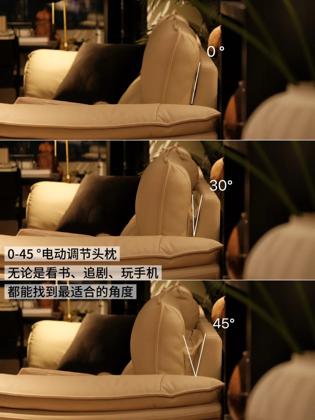 原本以为躺得舒展、打理方便就够完美了,没想到它的电动头枕设计可以0-45°进行调节,无论是半躺着喝东西🍹,还是看电视、看书,脖子都被稳稳托住,非常舒服