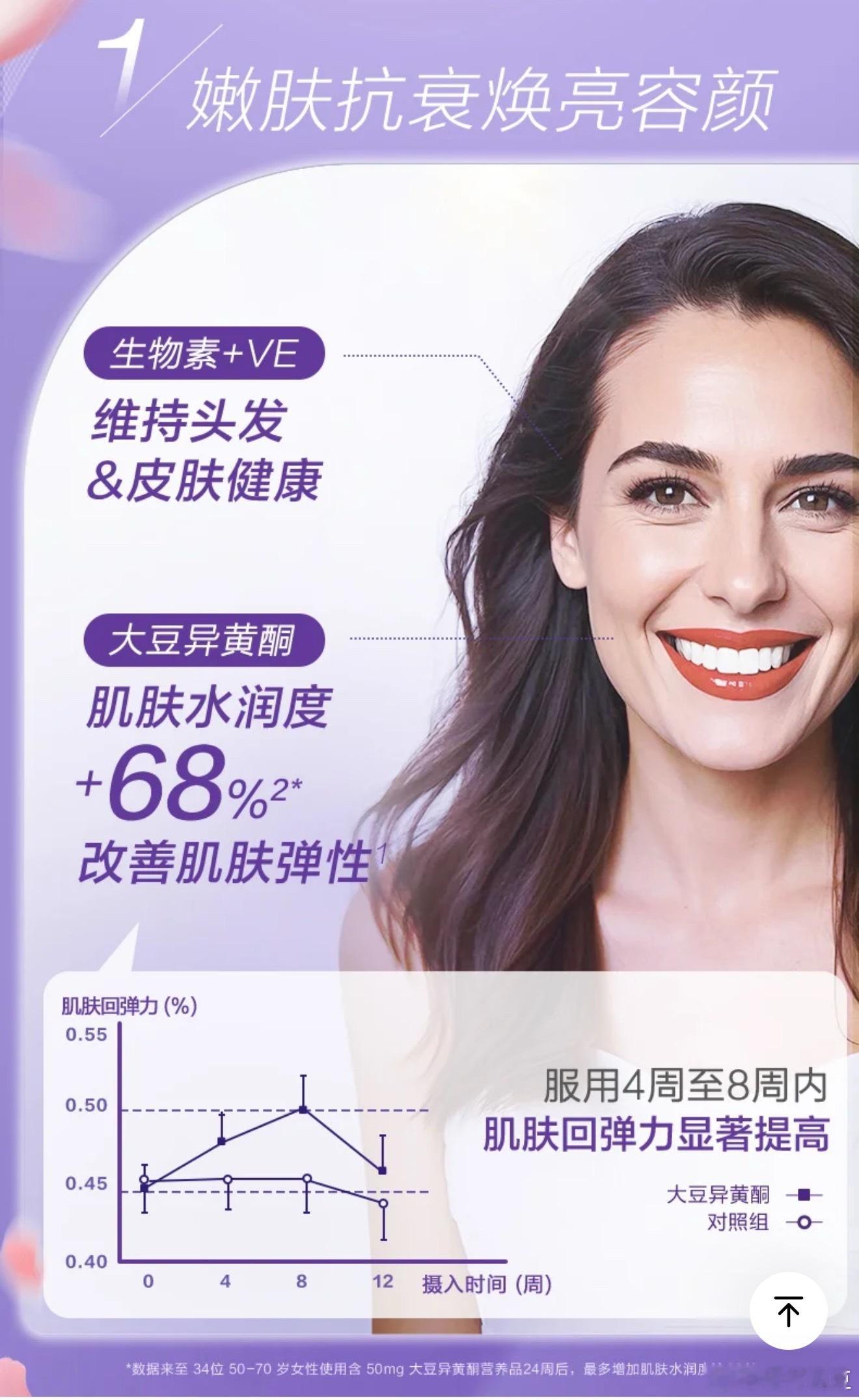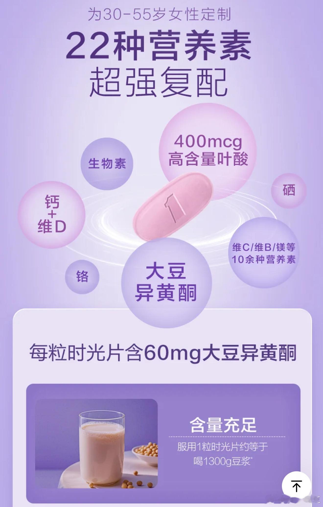 给四十多岁的姐妹们安利这个大豆异黄酮复合维生素,我记得前一段时间我在微博发过,当时有姐妹评论说这个是,补充雌激素的。是的,女性到了40岁以后雌激素水平下降了,40岁左右开始吃正好。如果你的例假不太正常,那就要早一点吃。我以前为了防脱发,还吃那种专门防脱发的维生素,现在那个已经不吃了,就只吃这种。我只推荐我自己亲自用过的东西的,我这瓶都快吃完了,是不是觉得我现在的发量还可以?这个里面有大豆异黄酮,叶酸,维生素B12等22种营养素,瓶盖里骨氨酸和COQ10。可以维持皮肤头发健康,肌肤水润度。还可以保护帮助骨骼和细胞健康,保护心脑血管,助力平衡血液循环。提升睡眠质量,减少80%的潮热症状。当时我想选一款大豆异黄酮吃,我选了拜耳,老牌药企,吃下来,证明我选对了。 硬核豌豆推荐的好物 ONE A DAY 拜耳时光片大豆异黄酮卵巢保养调理雌激素叶酸复合维生素50粒 · 时光片网页链接 网页链接