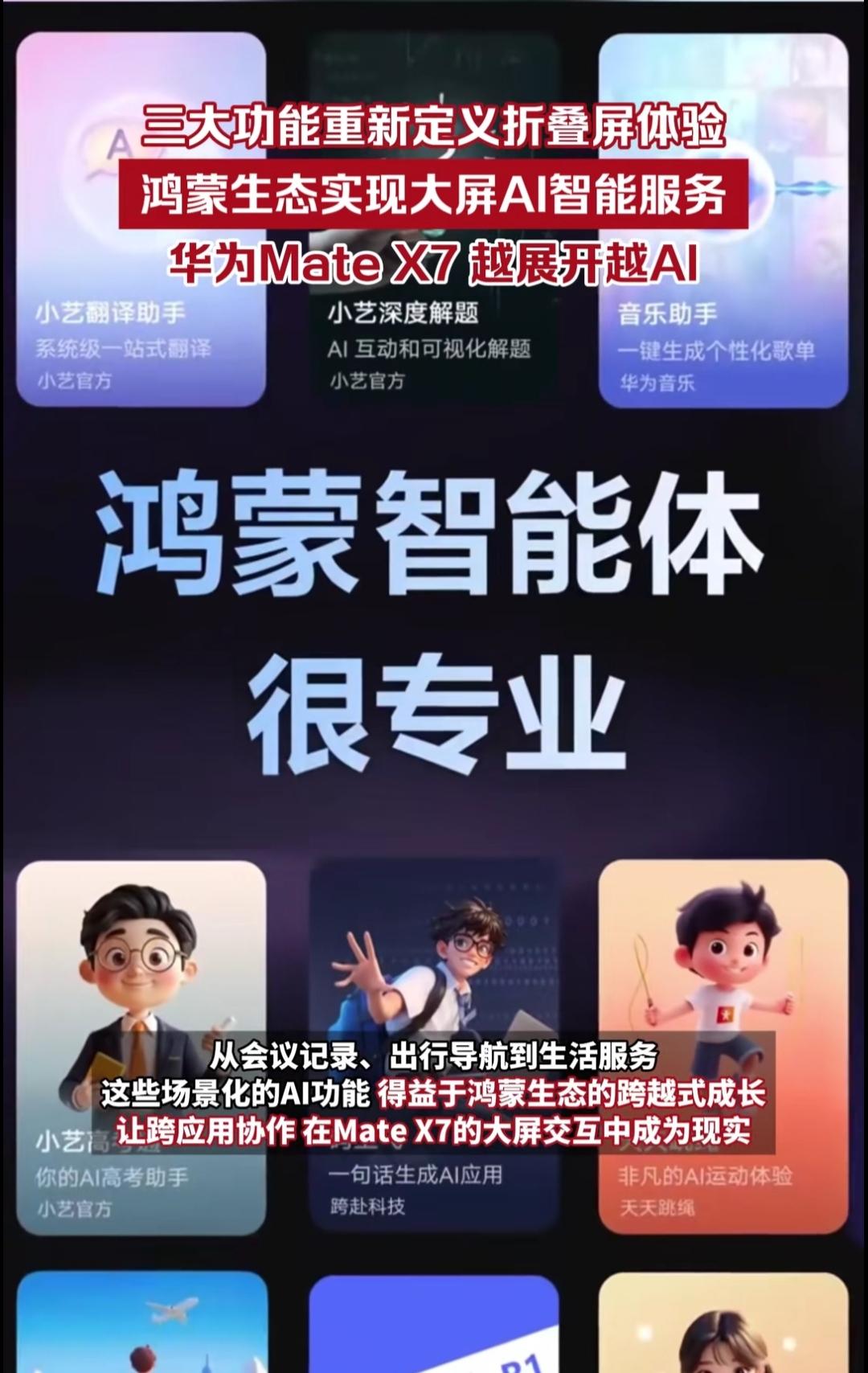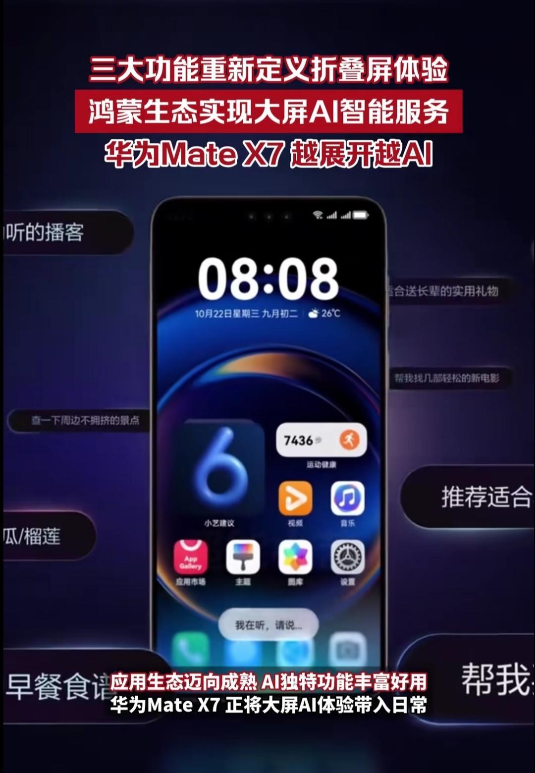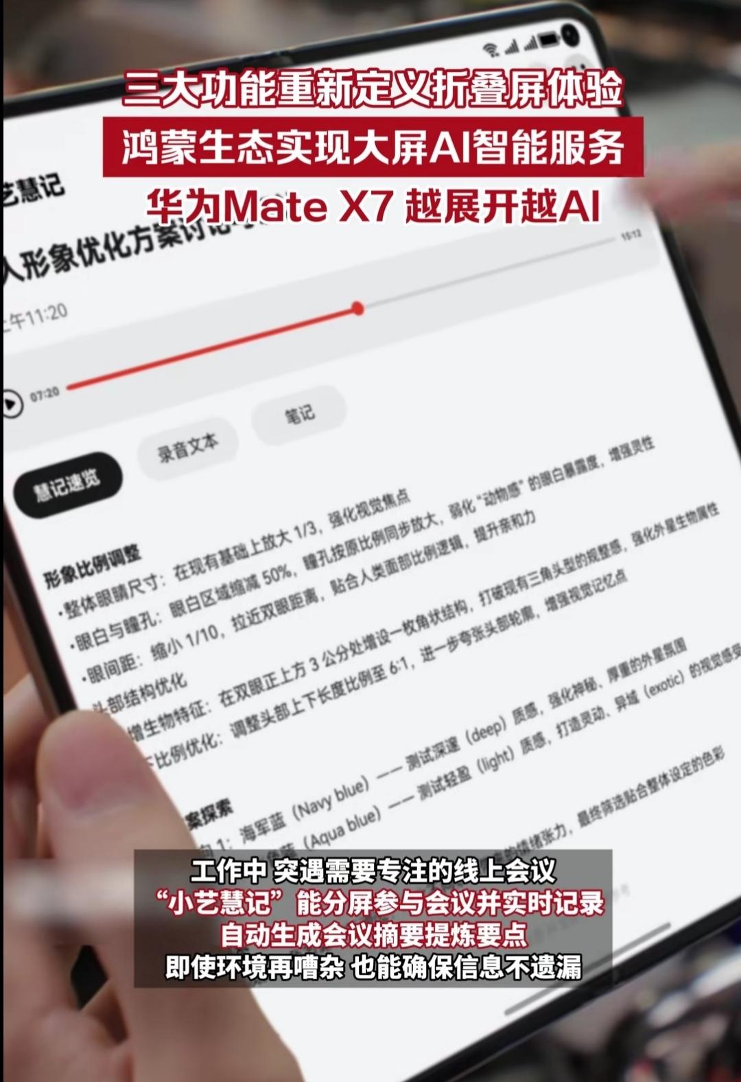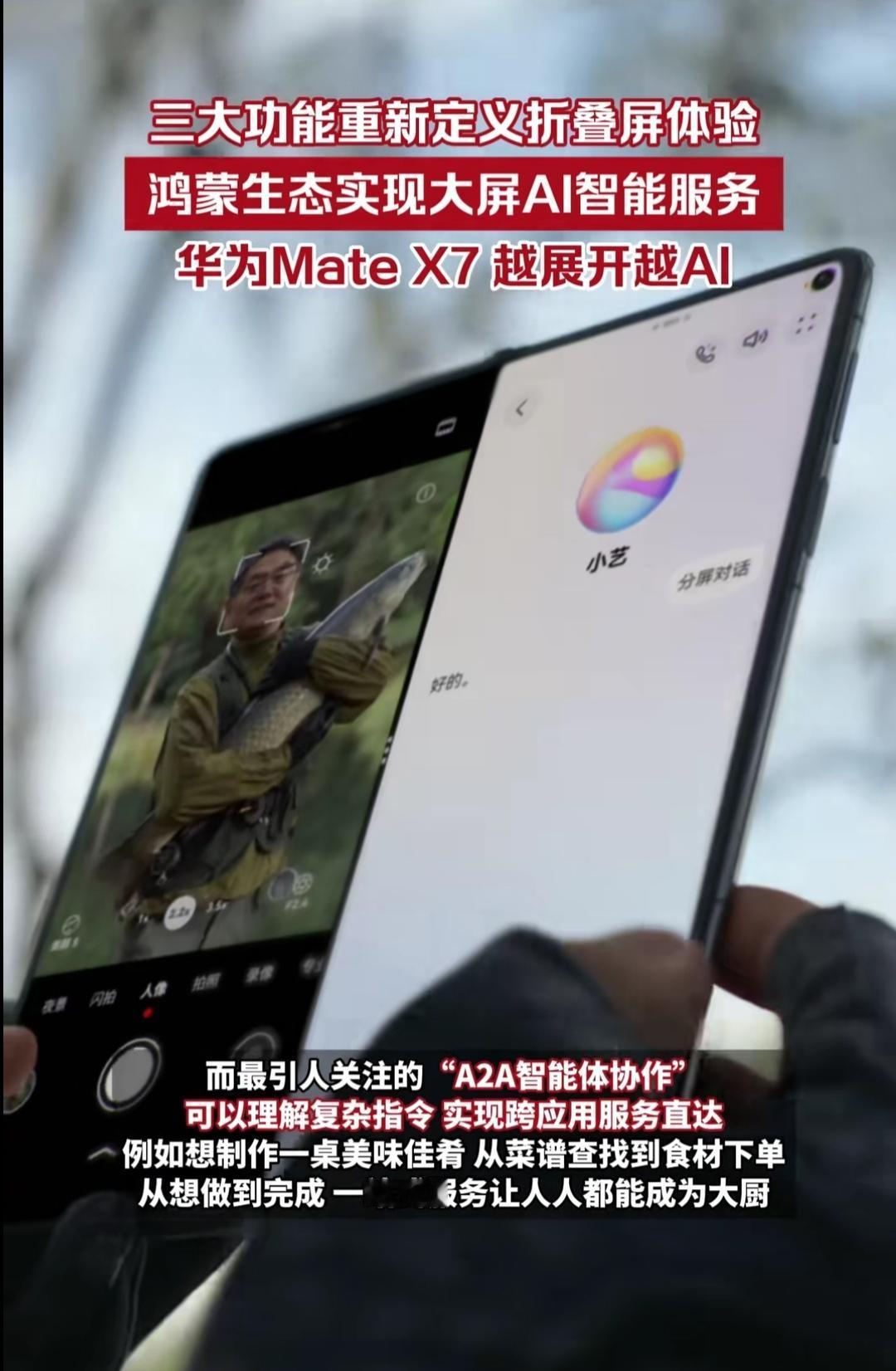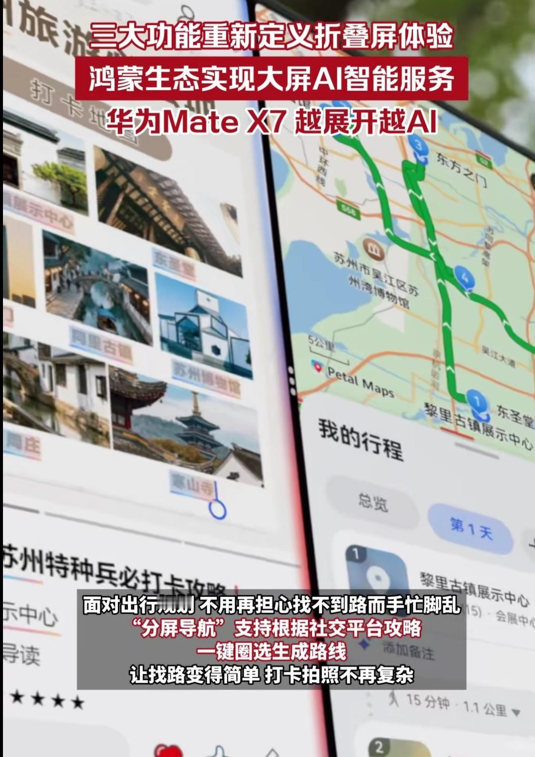 你敢信吗?华为Mate X7一展开,直接把AI嵌进了日常的每处细节!看这分屏开会议、一键导路线的操作,谁看了不说一句“这才是折叠屏该有的样子”。 开会时“小艺慧记”自动记要点,嘈杂环境也能精准抓信息,打工人再也不用手忙脚乱记笔记;出门做攻略,分屏就能把社交平台的打卡点一键圈成路线,特种兵旅游都不用慌;想做饭更省心,A2A智能体直接跨应用搞定菜谱、下单食材,一站式帮你成大厨。 以前总觉得折叠屏是“为了折而折”的花架子,可Mate X7把大屏AI和鸿蒙生态焊死在生活里——不是堆参数,是真的帮你省时间、少操心。这哪是升级手机,分明是给生活装了个智能“外挂”。 国产科技的厉害,从不是炫技,是把“方便”俩字揉进了柴米油盐。这种“越用越顺手”的体验,才是真的懂普通人想要什么。