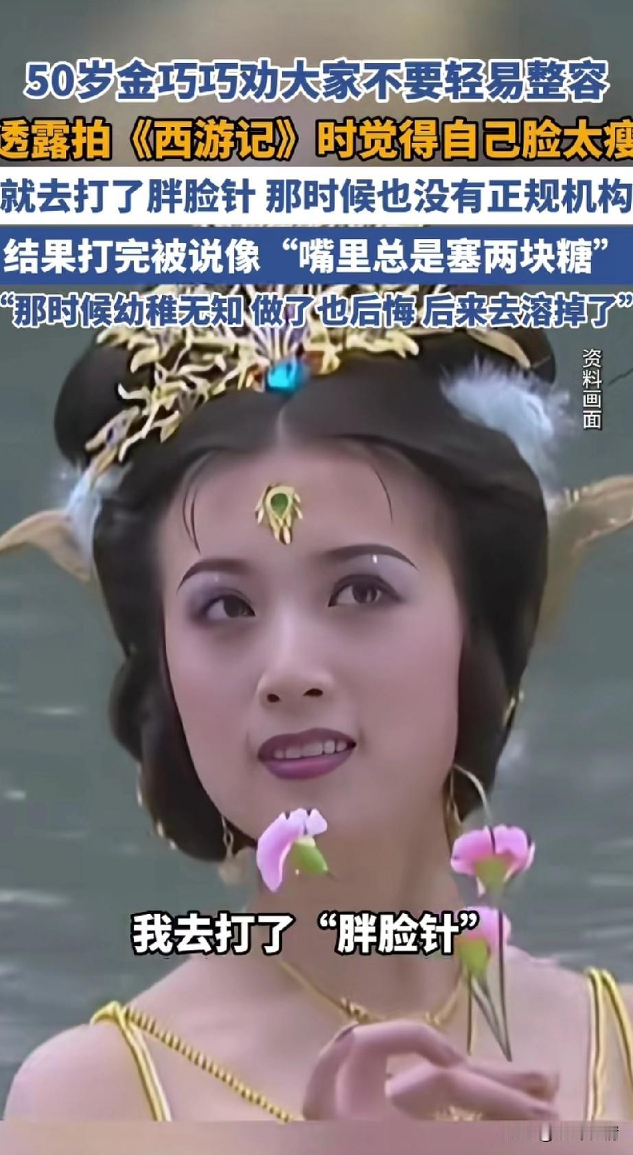50岁的金巧巧劝大家不要轻易整容, 她表示自己在拍《西游记》的时候, 觉得自己的脸太瘦了, 她在剧中演的孔雀精, 当时觉得非常的灵活, 不知为何她觉得自己的脸太瘦, 结果就去打了胖脸针, 当时也没有什么正规医疗机构, 打完之后别人说像嘴里面含了两块糖, 于是她就后悔了, 后来去融掉了, 觉得自己当时太年幼无知, 如今奉劝年轻人千万不要轻易去整容, 否则后悔就晚了, 毕竟整容是有风险的, 大家对于金巧巧这样的说法怎么看? 娱乐圈那点儿事 整容的人是出于什么原因 金巧巧 金巧巧公主 金巧匠珠宝 金巧蒂