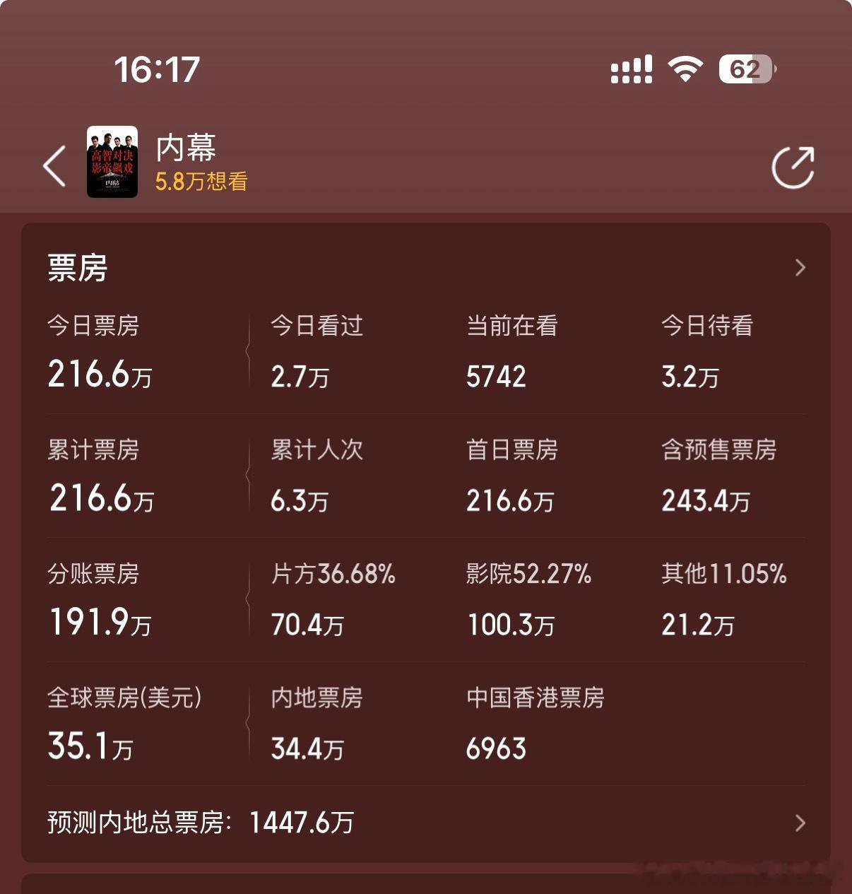 电影市场还是惨啊,内幕上映首日216万,总预测票房1447万,就算是郭富城吴镇宇