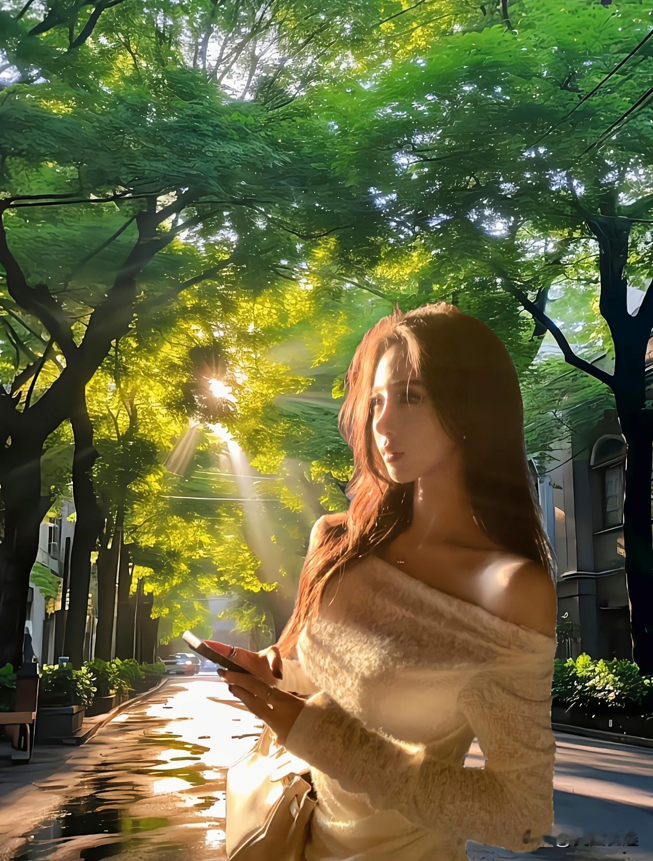 阳光洒落,少女漫步在树荫下,静谧而美好。