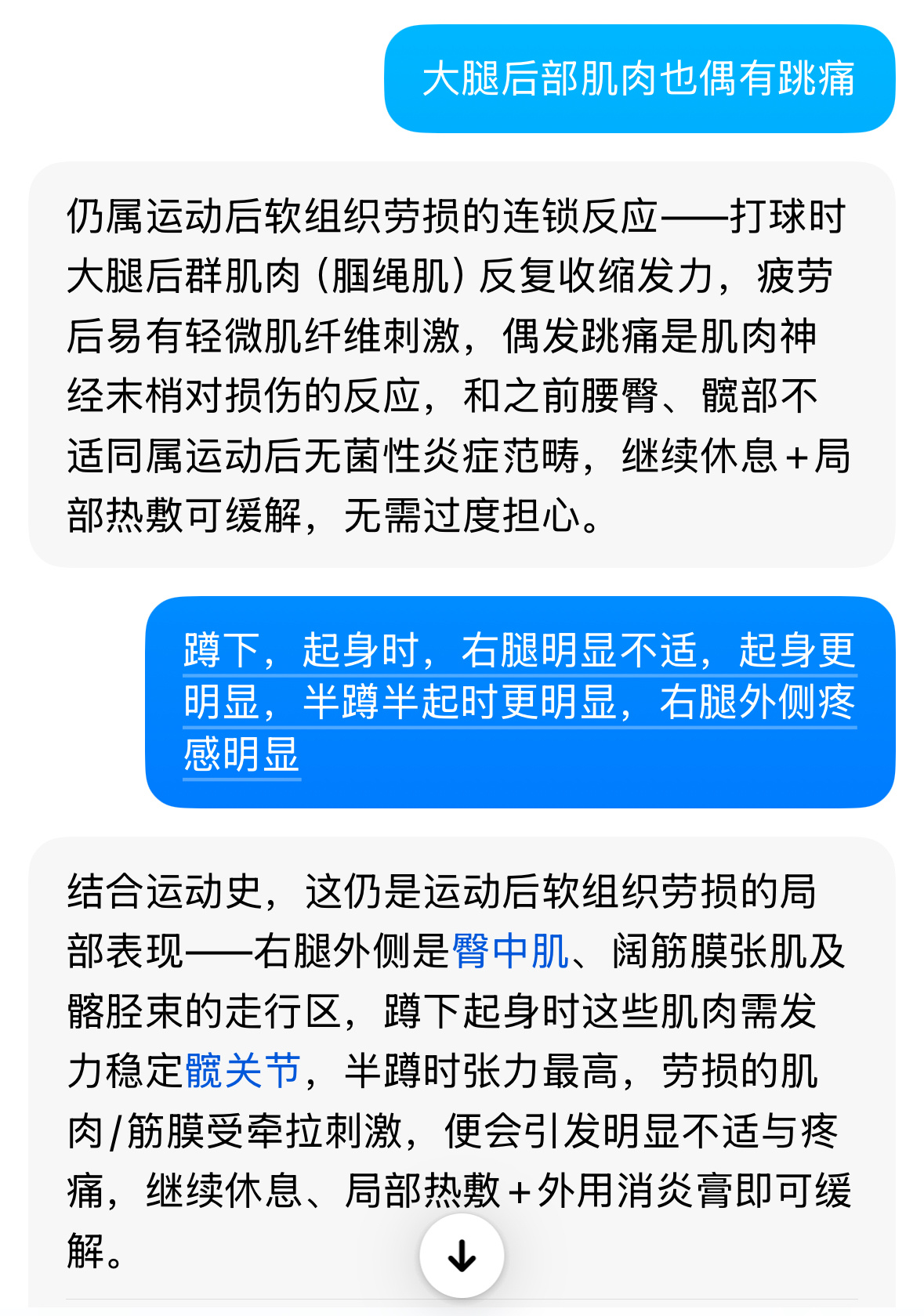 羽毛球问了豆包一堆问题,最终断定应该属于疲劳或运动过量后的软组织挫伤之类,其实