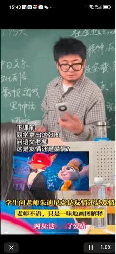 “用绘画来描述”!疯狂动物城2在中国内地上演,大学生在临下课时问语文老师:这是友情还是爱情?老师看了一眼画面,微微一笑,擦干净黑板,开始用作画来回答同学们的提问。 大学的语文老师正在教写作课,写作内容是社会热点与写作。 在临下课时,有位同学把一张图递给老师看,向他请教兔朱迪和狐狸尼克之间到底是爱情还是友情。 老师看了一眼,没有说一句话,只微微一笑,转身擦干净黑板。用绘画来描述爱情:爱一个人,眼神是藏不住的。 黑板上的尼克身体微微倾斜,双手捧着朱迪的脸,眼神中是温柔宠溺的笑容。而朱迪翘着小脸看向尼克。 哇哦,同学们沸腾了!没想到语文老师的绘画这么绝! 有的同学说:老师,来个吃瓜群众。 老师转身在黑板上画了一条戴着方框眼镜的大头蛇,蛇尾巴上甩出小爱心💗。我怎么觉得这吃瓜的大头蛇像极了老师呢? 这还是语文老师吗?美术老师吧! 取材网络,侵删