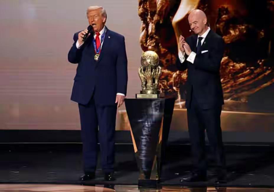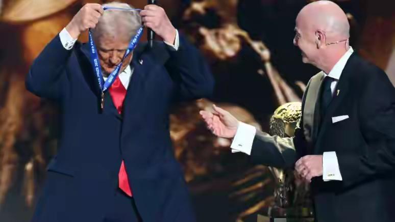 特朗普终获“和平奖”,背后却是国际足联的精心“安排”。 在华盛顿肯尼迪中心,一场本该决定世界杯命运的抽签仪式,变成了为美国总统颁发的加冕礼——一枚金灿灿的奖牌被特朗普亲手戴在自己颈间。 “这无疑是我人生中至高的荣誉之一。”美国总统特朗普在接过奖牌时说道。12月5日,在2026年美加墨世界杯抽签仪式上,国际足联主席詹尼·因凡蒂诺将首届“国际足联和平奖”颁给了特朗普,表彰他“为促进全球和平与团结所采取的非凡行动”。 然而,这一旨在“团结世界”的足球奖项,却因颁发给一位极具争议的政治人物而瞬间撕裂了舆论。在部分人眼中,这是对一位“和平缔造者”的认可;在更多人看来,这是国际体育组织放弃中立、投身政治的一场尴尬表现。 颁奖时刻充满了戏剧性。在全球瞩目的世界杯抽签仪式开始前,因凡蒂诺将一枚金色的和平奖奖牌和一座刻有特朗普名字的奖杯递给了他。 奖杯的造型是双手托起世界。特朗普没有等待他人协助,而是亲手将奖牌挂在了自己的脖子上。这一画面通过直播传遍全球,被视为其标志性的个人主义姿态。 凡蒂诺在颁奖词中不吝赞美,称特朗普“绝对配得上这首个国际足联和平奖”,并承诺“整个足球界都将支持你缔造和平”。 对于特朗普而言,这个奖项圆了他一个长久的念想。他长期以来一直公开寻求获得诺贝尔和平奖。 国际足联的这份“首发”殊荣,被广泛解读为是对其未能获得诺奖的一种替代性补偿。《财富》杂志的文章标题便一针见血:“特朗普终于得到了他的和平奖——从一个以腐败闻名的足球联合会那里”。 特朗普在获奖感言中声称:“我们拯救了数百万人的生命”,并列举了其政府的多项外交成果。 对国际足联而言,颁发此奖是一场巨大的声誉赌博。该组织尚未从十年前那场震惊世界的腐败案中完全恢复声誉。 此举不仅损害了其自身的公信力,也可能疏远那些希望足球远离政治纷争的广大球迷。这为“将象征性的认可基于政治关系而非对全球和平的可验证贡献”开了一个危险的先例。 特朗普将金牌挂在胸前,宣称世界“现在更安全了”。然而,场外人权组织的抗议声和全球舆论的哗然,与场内精心编排的颂扬形成了刺耳的和声。 国际足联试图用“足球团结世界”的旋律为一位总统伴奏,却意外奏响了一曲关于体育政治化、领袖形象工程与机构信誉风险的复杂交响。这枚突如其来的和平奖牌,最终折射出的不是共识,而是这个时代深刻的裂痕与纷争。