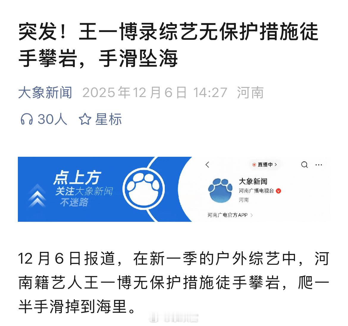 下午一堆朋友给我发来各种媒体推送询问王一博攀岩怎么了在攀岩人眼里水上抱石从岩壁上脱落是个正常的再正常不过的事就跟我们在岩馆抱石九成以上都是在体验失败一样只要经过了专业训练这种水上脱落几乎没有风险何况节目组还做了各种万一的急救方案媒体同行们这些标题太吓人了说到底,大家该像他一样体验学习攀岩啦王一博徒手攀手滑掉海里了