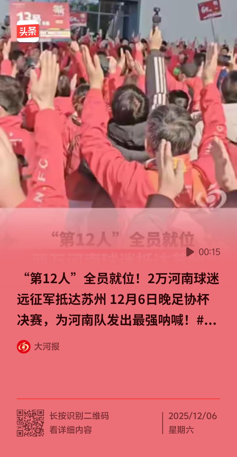 2万河南球迷组成的红色远征军抵达苏州,这阵仗太震撼了!他们跨越数百公里,统一的红色球衣、挥舞的队旗、震天的口号,把客队看台变成红色海洋。为了给家乡球队助威,他们早早就抢票,没抢到就高价买中立区门票,辗转多地也要到现场。主办方还开通了观赛专列,一路都是歌声和口号声。 相比之下,国安有7000余名球迷到现场,京豫球迷比例达1比3。不过国安球迷组织准备了绝活,用整齐的歌唱、鼓点、口号和看台TIFO展示球迷文化。这场决赛,注定会因球迷们的热爱而精彩! 河南队 河南球迷