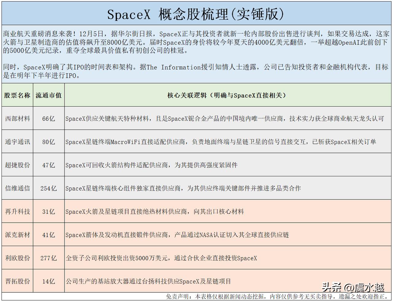 SpaceX核心信息及国内供应商整理 一、SpaceX核心动态与关键数据 1. 估值与股权出售 ① 启动新一轮现有投资者及员工持股出售,目标估值达8000亿美元(约合人民币5.65万亿元),交易完成后将超越OpenAI,重夺全球估值最高独角兽称号。 ②今年7月融资时估值为4000亿美元,半年内估值翻倍,商业航天价值凸显。 2. 上市计划 ① 瞄准2025年下半年进行首次公开募股,计划整体上市,搁置此前“星链”单独上市的想法。 ② 上市将大幅提升马斯克身价,其持有SpaceX约42%股权,按8000亿美元估值计算,这部分股权价值将达3360亿美元。 3. 业务与运营数据 ① 核心业务:火箭发射、卫星互联网(“星链”为核心)。 ②星链进展:部署约9000颗卫星,全球活跃用户超800万。 ③营收预期:2024年预计营收155亿美元,卫星互联网业务是高估值核心推动力。 二、国内商业航天行业趋势 1. 政策与技术催化 ① 国家层面:成立商业航天司,发布商业航天高质量发展行动计划,覆盖产业布局、资金支持等多维度。 ②技术突破:朱雀三号可回收运载火箭实现入轨,长征十二A、天龙三号有望近期集中首飞。 2. 火箭端发展亮点 ① 民营大运力可回收火箭加速研制,发射成本将大幅降低。 ② 发射工位加速建设,海南商发二期、东风商业航天创新试验区新工位将提升发射频次,缓解低轨卫星发射运力瓶颈。 3. 卫星端发展亮点 ① 通信星座:星网加速组网,大规模组网即将启动,载荷端、终端市场潜力大。 ② 算力星座:巨头纷纷布局,解决数据利用率低问题,国内有望同步规划。 三、国内相关核心标的 1. 火箭端 ①铂力特:发动机增材制造 ② 高华科技:火箭传感器 ③九丰能源:特燃特气配套 ③ 斯瑞新材:燃烧室内壁 ④航天动力:大股东为航天六院 ⑤ 国科军工:固体发动机 2. 卫星测试端 ①广电计量:检测服务 ② 霍莱沃:检测设备 ③ 西测测试:检测服务 3. 卫星载荷端 ①*ST铖昌:TR芯片 ② 臻镭科技:ADC/DAC、DBF、TR SIP组件 ③ 航天电子:激光通信模块 ④ 国博电子:TR组件、手机PA ⑤陕西华达:射频连接器 4. 卫星终端及测运控端 ① 海格通信:地面终端 ② 星图测控:火箭及卫星测运控、太空感知星座 5. 太空算力端 ①星图测控:太空感知星座 ②普天科技:三体计算星座 四、SpaceX国内供应商 ① 上海瀚讯:SpaceX通信载荷技术验证 ② 天银机电:SpaceX星敏感器配套 ③信维通信:SpaceX星链地面终端设备高频高速连接器 ④通宇通讯:通过SpaceX接口认证 ⑤ 再升科技:SpaceX火箭用超高温绝热材料(航空级超细玻璃纤维棉) SpaceX 概念股梳理一览表