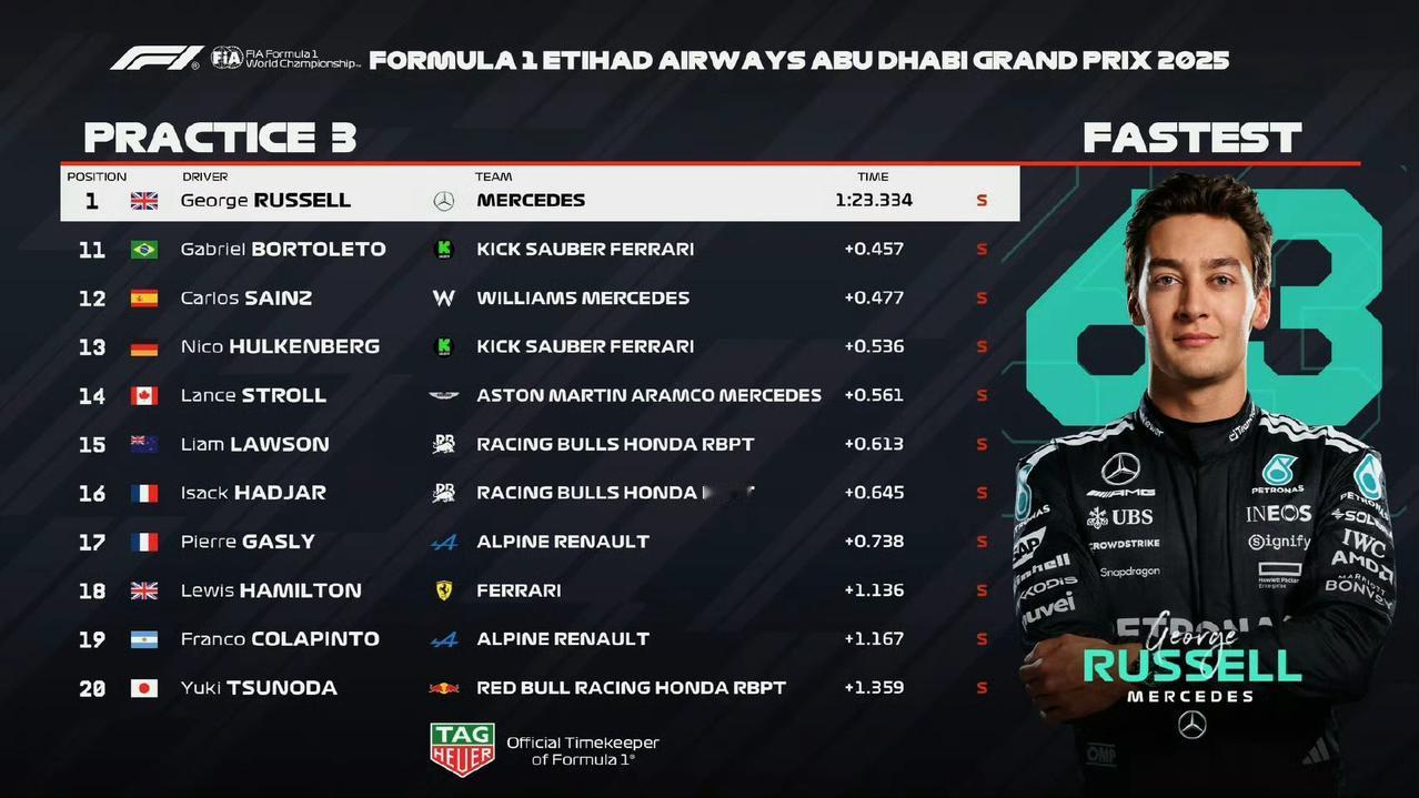 2025F1阿布扎比大奖赛三练成绩: 拉塞尔取得头名,诺里斯和维斯塔潘分列二三位,皮亚斯特里第五。 汉密尔顿遭遇事故排名第18。